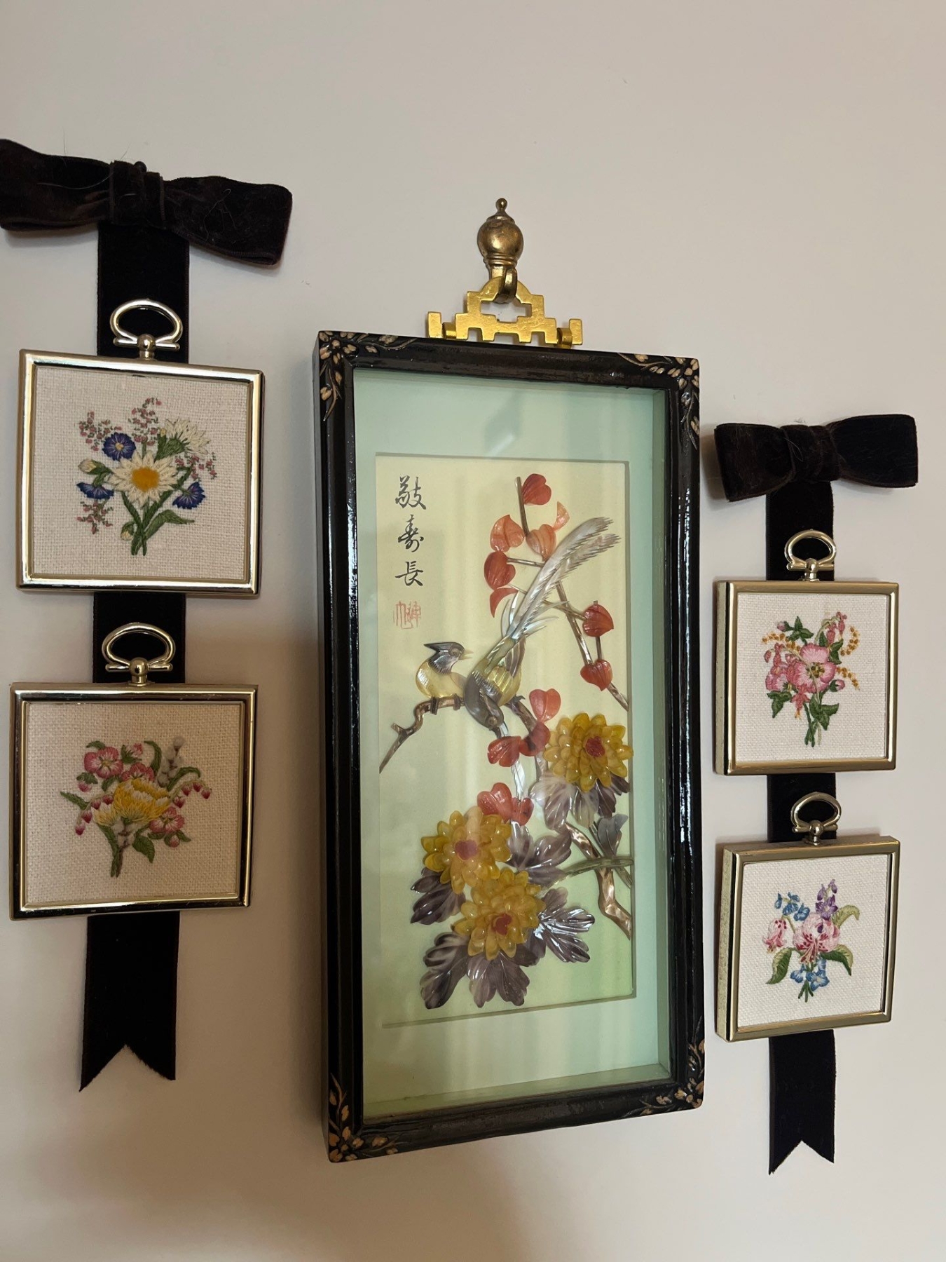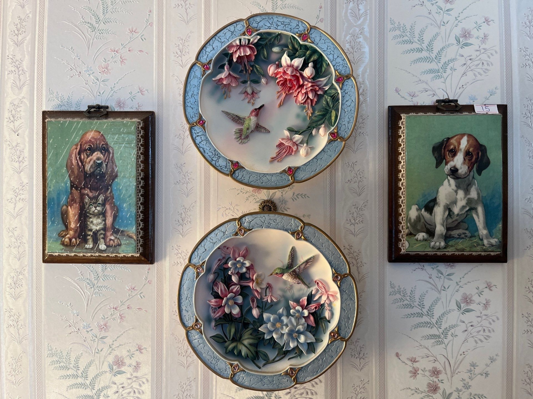 Collection of small pictures and collectible, hummingbird plates along with a Asian themed vintage shadowbox made with small rocks