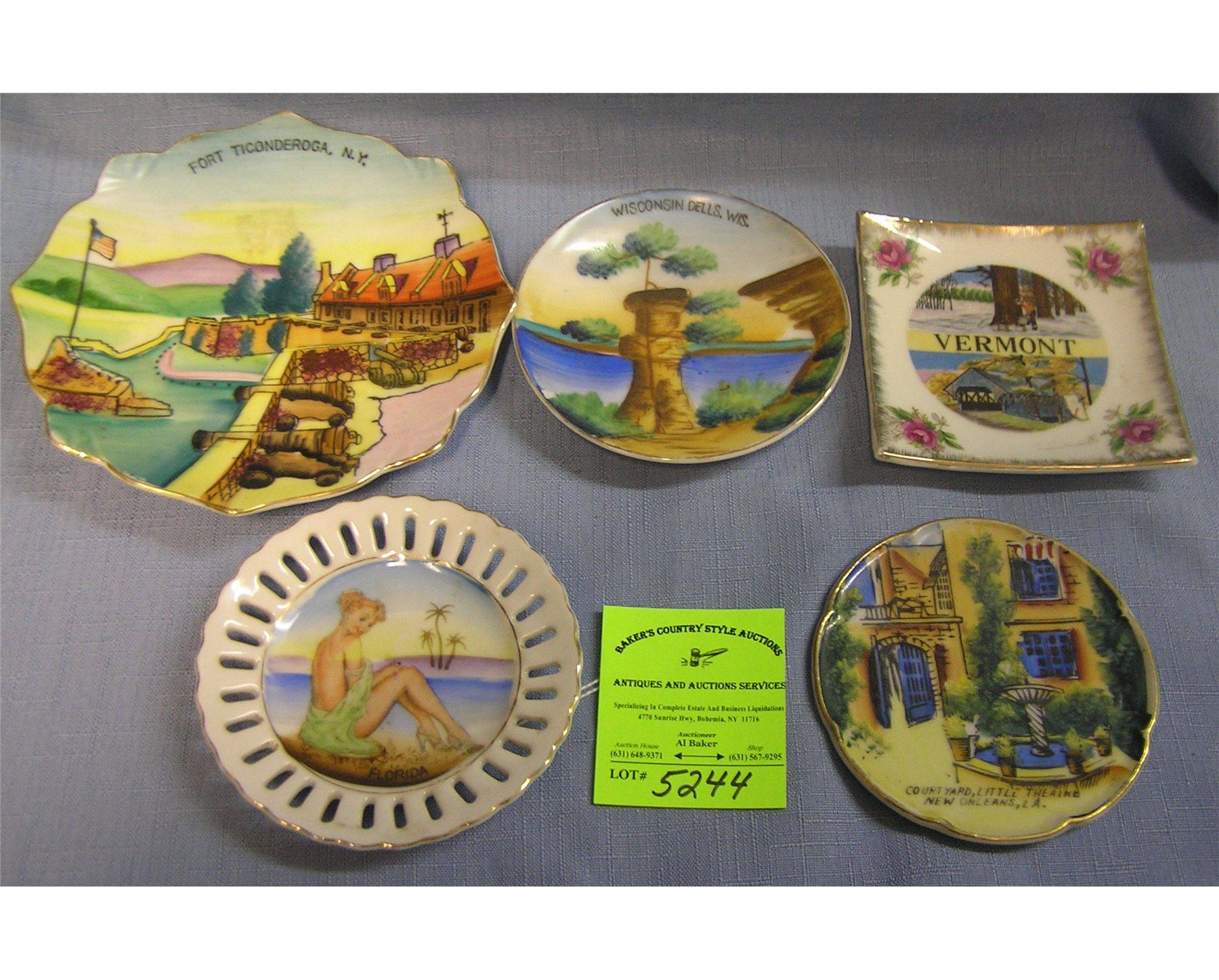 Collection of souvenir dishes includes, Florida, Wisconsin, New Orleans, Vermont and New York est. value $125.00-$150.00