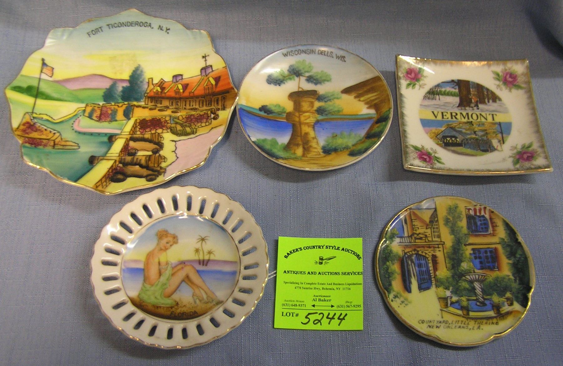 Collection of souvenir dishes includes, Florida, Wisconsin, New Orleans, Vermont and New York est. value $125.00-$150.00