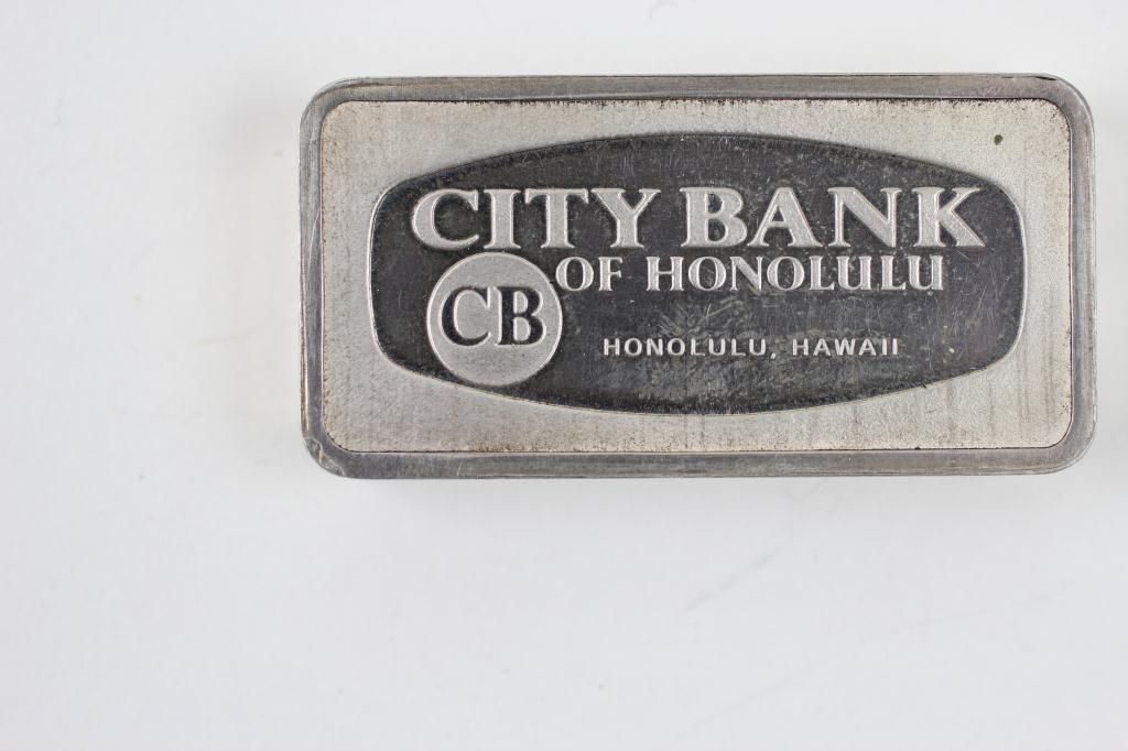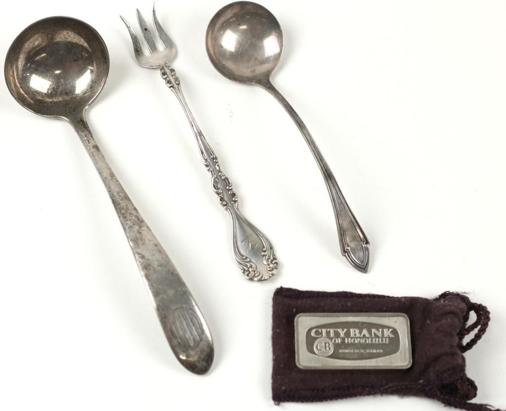 Collection of sterling silver includes, 1972 bank marked Ingot from City Bank of Honolulu 2 troy ounces and 3 antique serving pieces. Est. 50-150
