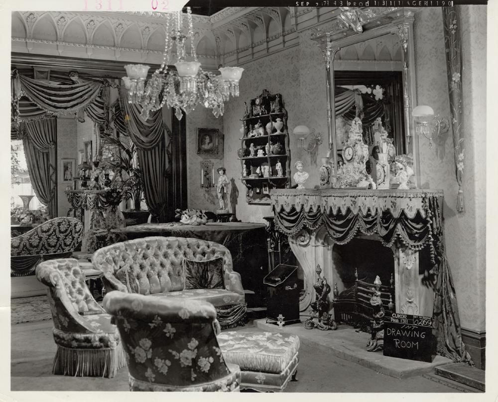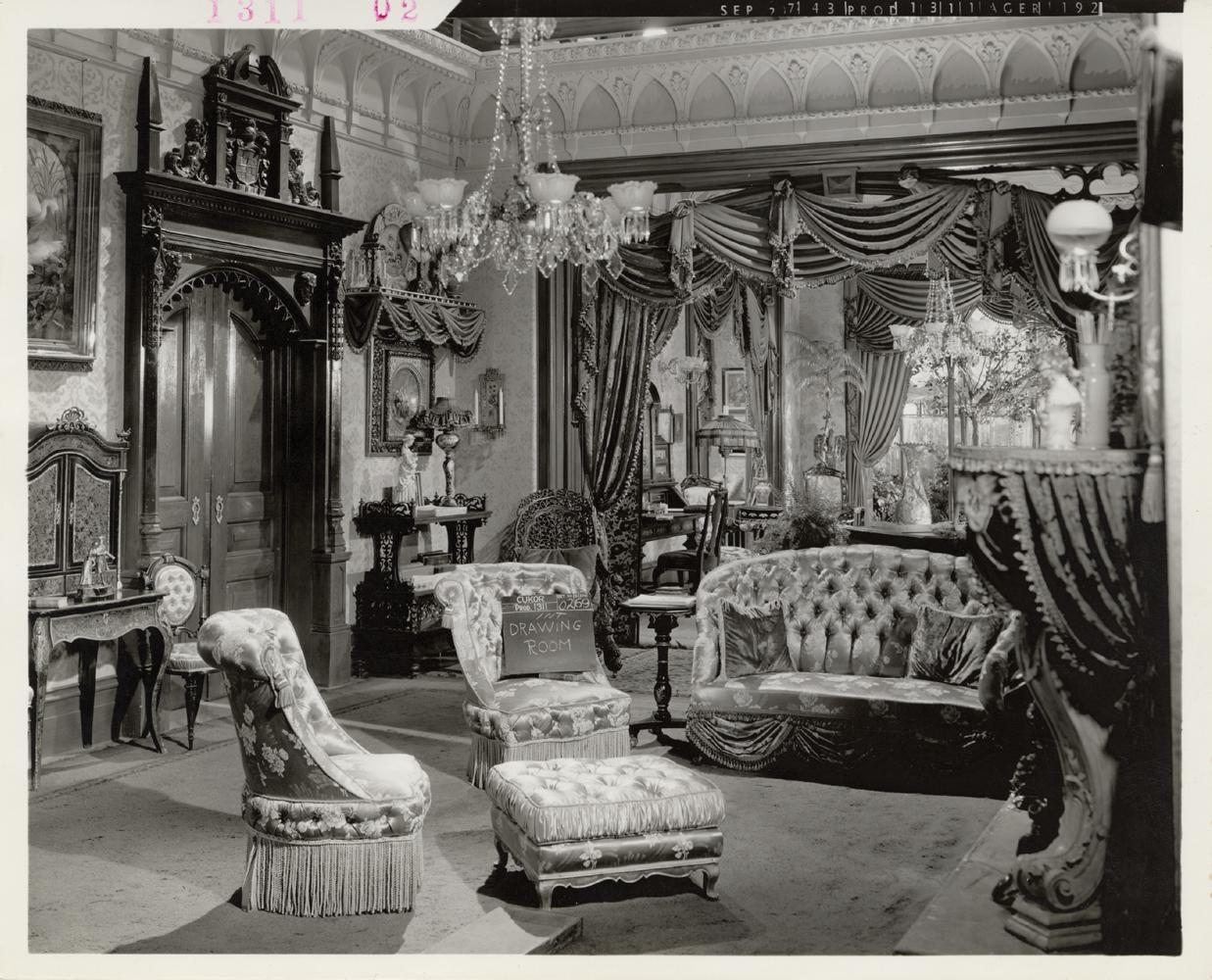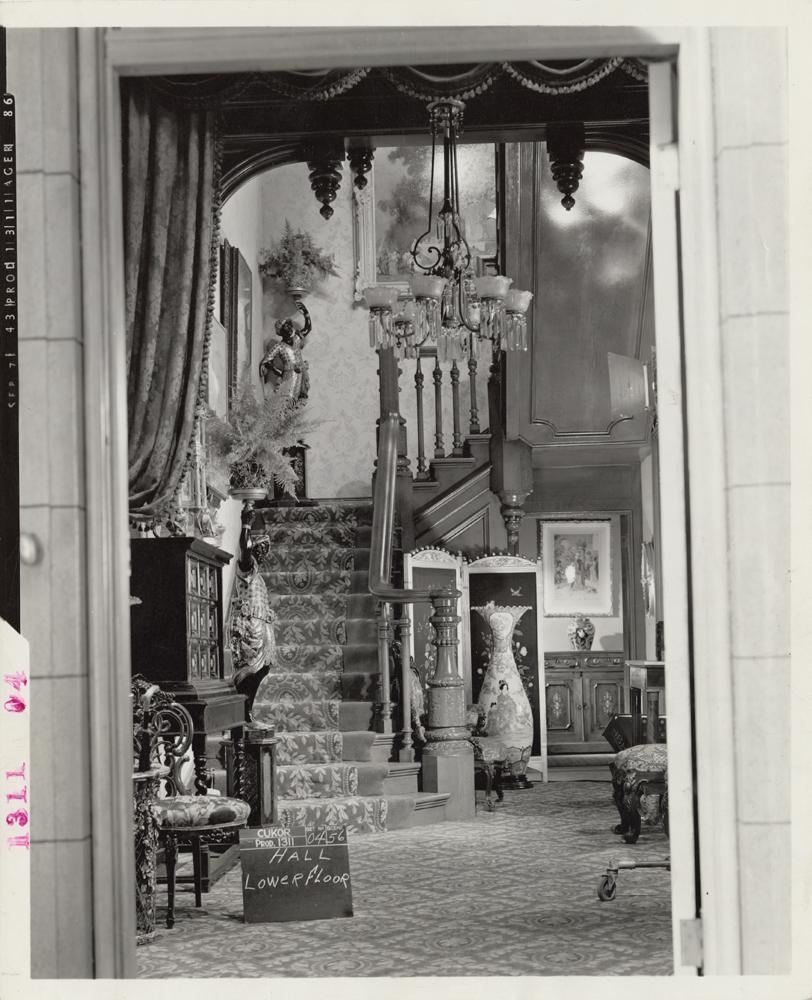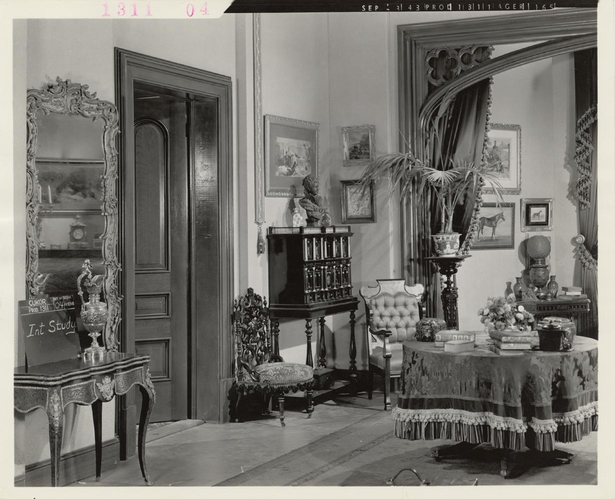 (MGM, 1944) (13) Gelatin silver prints, 8 x 10” documenting the interior sets for the George Cukor-directed film Gaslight, starring Ingrid Bergman and Charles Boyer. The interiors for this seminal work were a critical element in establishing the heavy and menacing atmosphere necessary to transform what might have been merely another routine costume melodrama into a serious entry in the film-noir canon. Condition is Near Mint throughout.