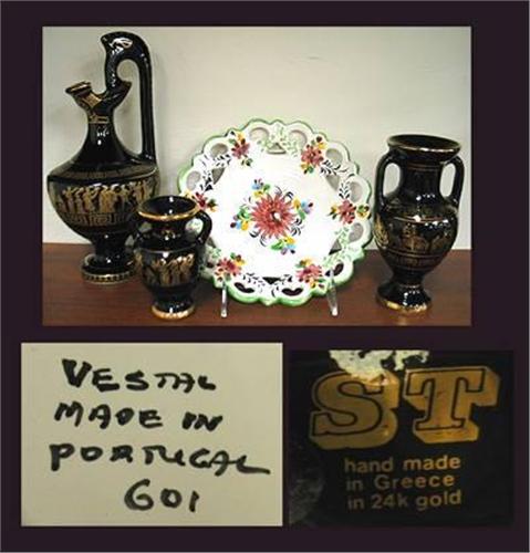Collection of three decorative urns with Greek designs on them in gold and one decorative dish. Dish measures 7 1/2" across the tallest urn stands 9 1/4" tall