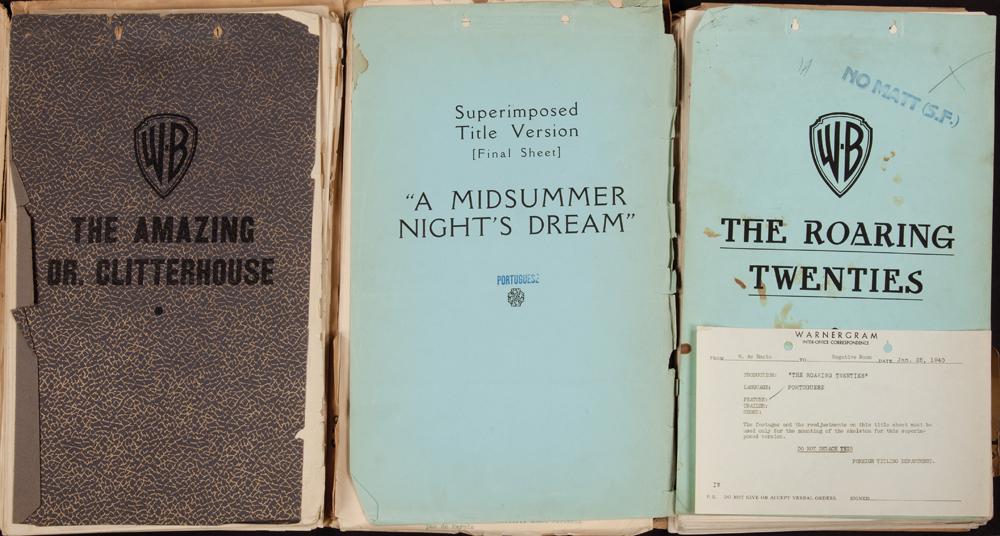 Collection of three dialogue subtitling scripts for James Cagney and Humphrey Bogart films including Roaring Twenties, Amazing Dr. Clitterhouse, and Midsummer Night’s Dream. (Warner Bros., 1935-39) Legal-size original studio dialogue-continuity scripts (3) with extensive typed and hand-written notes for foreign-language subtitling, unbound, in original studio printed wraps. Roaring Twenties starring Humphrey Bogart and James Cagney contains 133 pp; Amazing Dr. Clitterhouse starring Humphrey Bogart contains 125 pp; Midsummer Night’s Dream starring James Cagney, contains 95 pp. Some chipping to wraps, interiors are intact and in near fine condition.