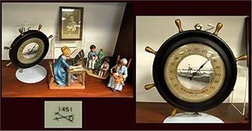 Collection of three porcelain figurines with faux marks, vintage advertising ships wheel Thermometer from The M.A. Hanna Coal & Dock Co. St Paul and a vintage framed baby print. Thermometer wheel is missing one spoke