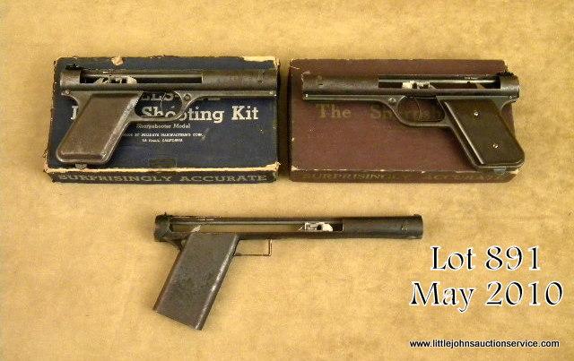 Collection of three relatively rare “Bulls-Eye” rubber band powered target BB pistols. These very accurate target pistols allowed target practice within the home or indoor “shooting range”; they used rubber band power to shoot lead shot at paper or spinning targets attached to the shipping box. The box retained the shot for reuse. Two of the pistols were manufactured by the Bulls-Eye Manufacturing Company in Rawlins, WY in the late 1920’s or early 1930’s; one of these two is 9”overall and made of stamped light metal including integral grips and in overall fair + condition; the other is 7-1/2” overall with brown plastic grips and contained in its original factory two piece cardboard box with target and a bag of shot in original Bulls-Eye labeled pouch, in overall good condition; the third piece is in its original two piece cardboard box with a La Jolla, California address (company sold to new owners by the Rawlins, Wyoming firm) including a 7-1/2”overall stamped light metal frame, grip and barrel with three tubes of Bulls-Eye marked BBs in overall good condition. Also included are instruction sheets for all three Models. Est.: $150-$300.
