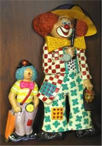 Collection of two wall clowns. One stands about 13" tall the other 8" tall in good condition. Made in Spain
