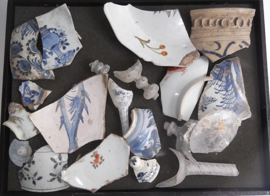 Collection of various porcelain/glass/pottery artifacts. Sizes range from 2 inches to 6 1/4 inches.