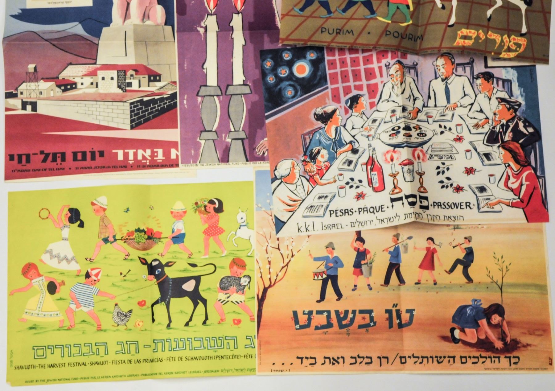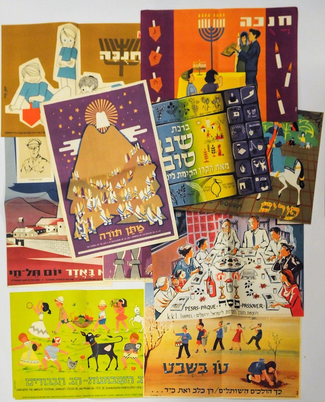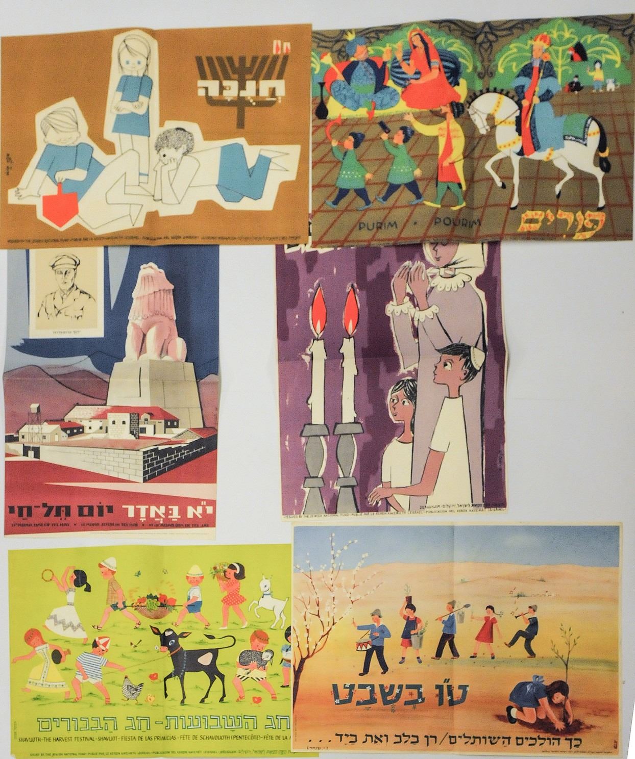 Collection of various small NJF posters, including special holiday posters: Rosh Hashana, Purim, Passover, Shavuot, Tu Bishvat, 2 Hanukkah posters, Matan Torah, Shana Tova, Shabbat Shalom and special poster for the Tel Chai Day. Good-very good conditions: tear in lower margin of the Shana Tova poster and some creasing. Dimensions: 47x33 cm.