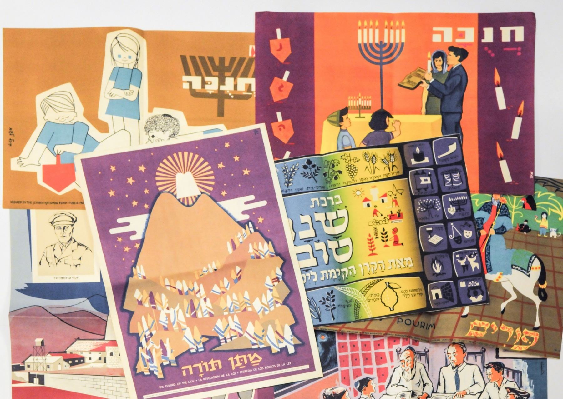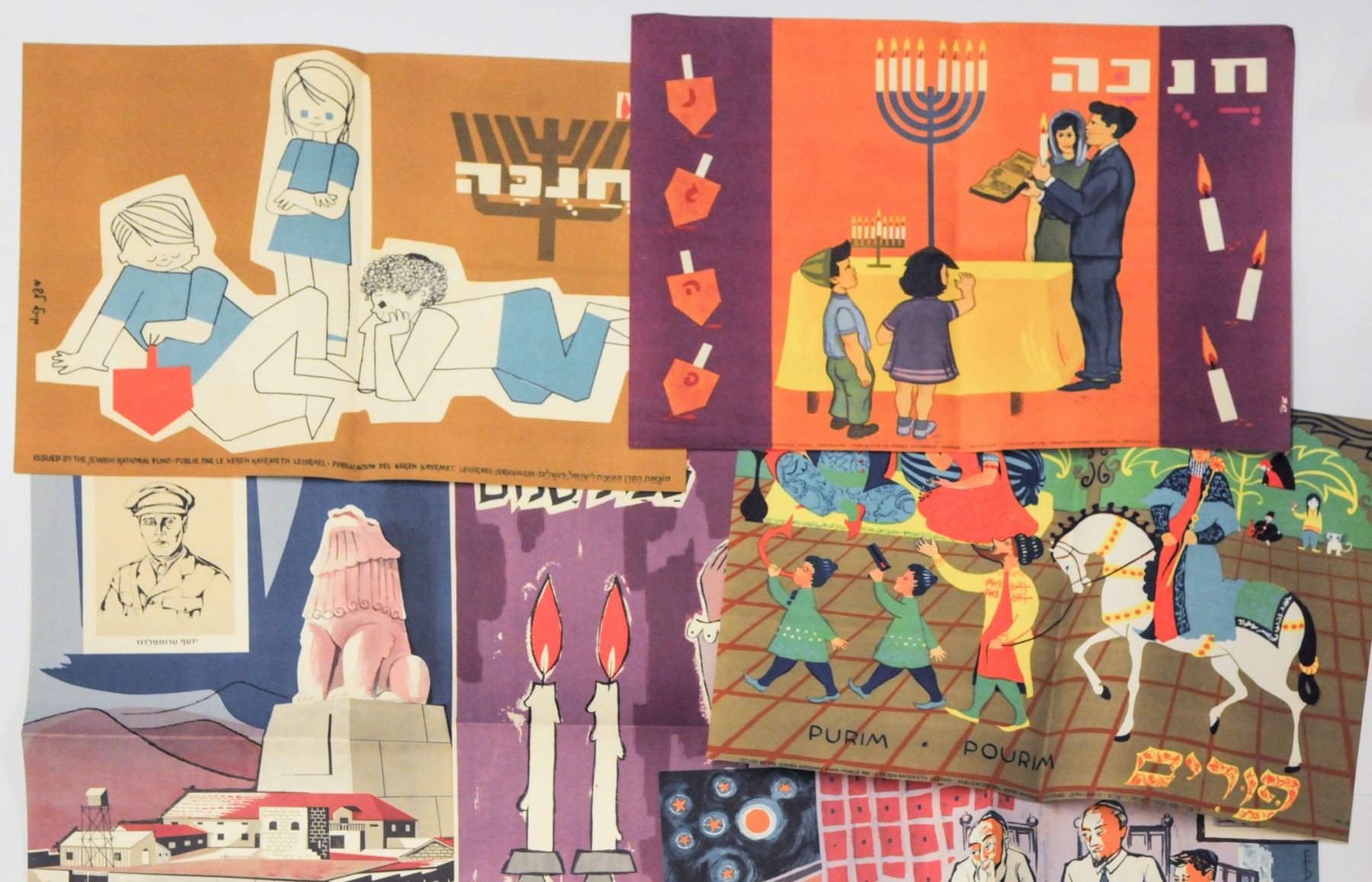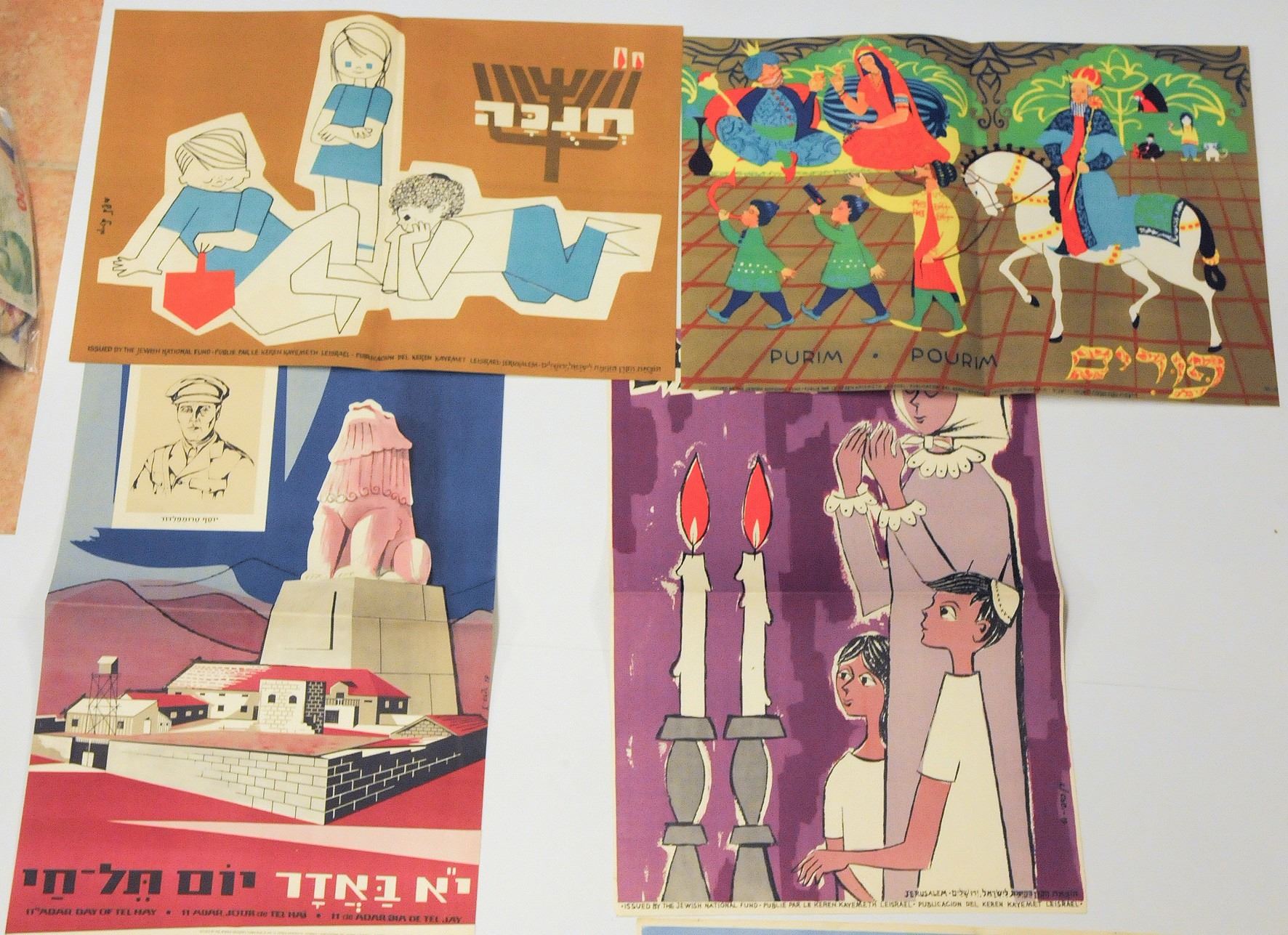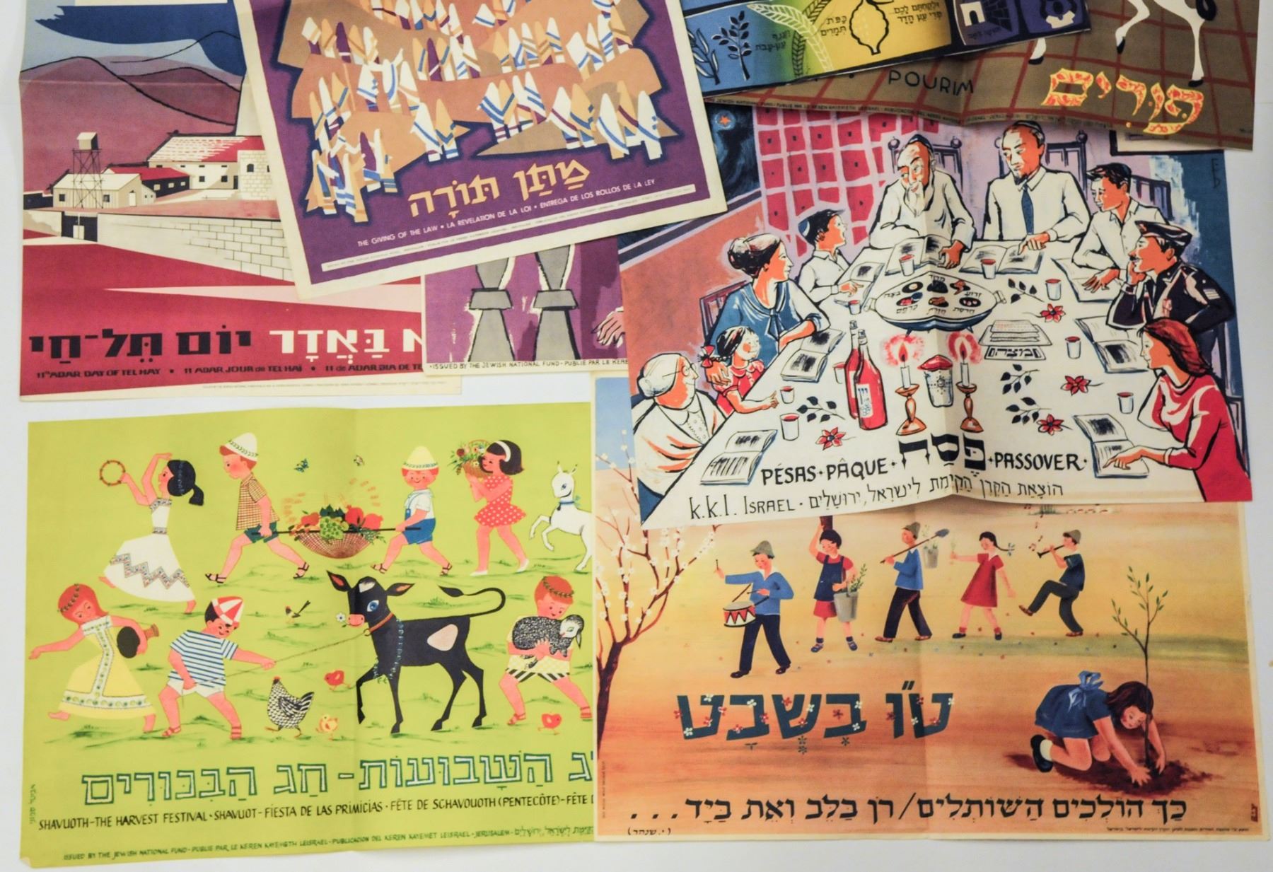 Collection of various small NJF posters, including special holiday posters: Rosh Hashana, Purim, Passover, Shavuot, Tu Bishvat, 2 Hanukkah posters, Matan Torah, Shana Tova, Shabbat Shalom and special poster for the Tel Chai Day. Good-very good conditions: tear in lower margin of the Shana Tova poster and some creasing. Dimensions: 47x33 cm.