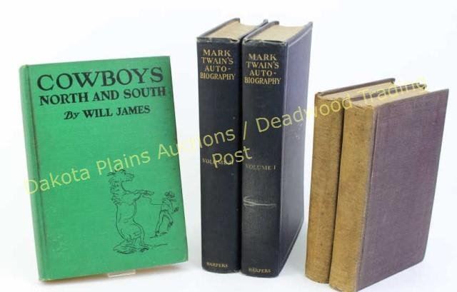 includes 1st edition Volume 1 and 2 Mark Twains Autobiography blue covers with inscriptions 1924, two volume History of Reformation of 16th century and 1936 Will James Cowboys North and South. Est. 50-100