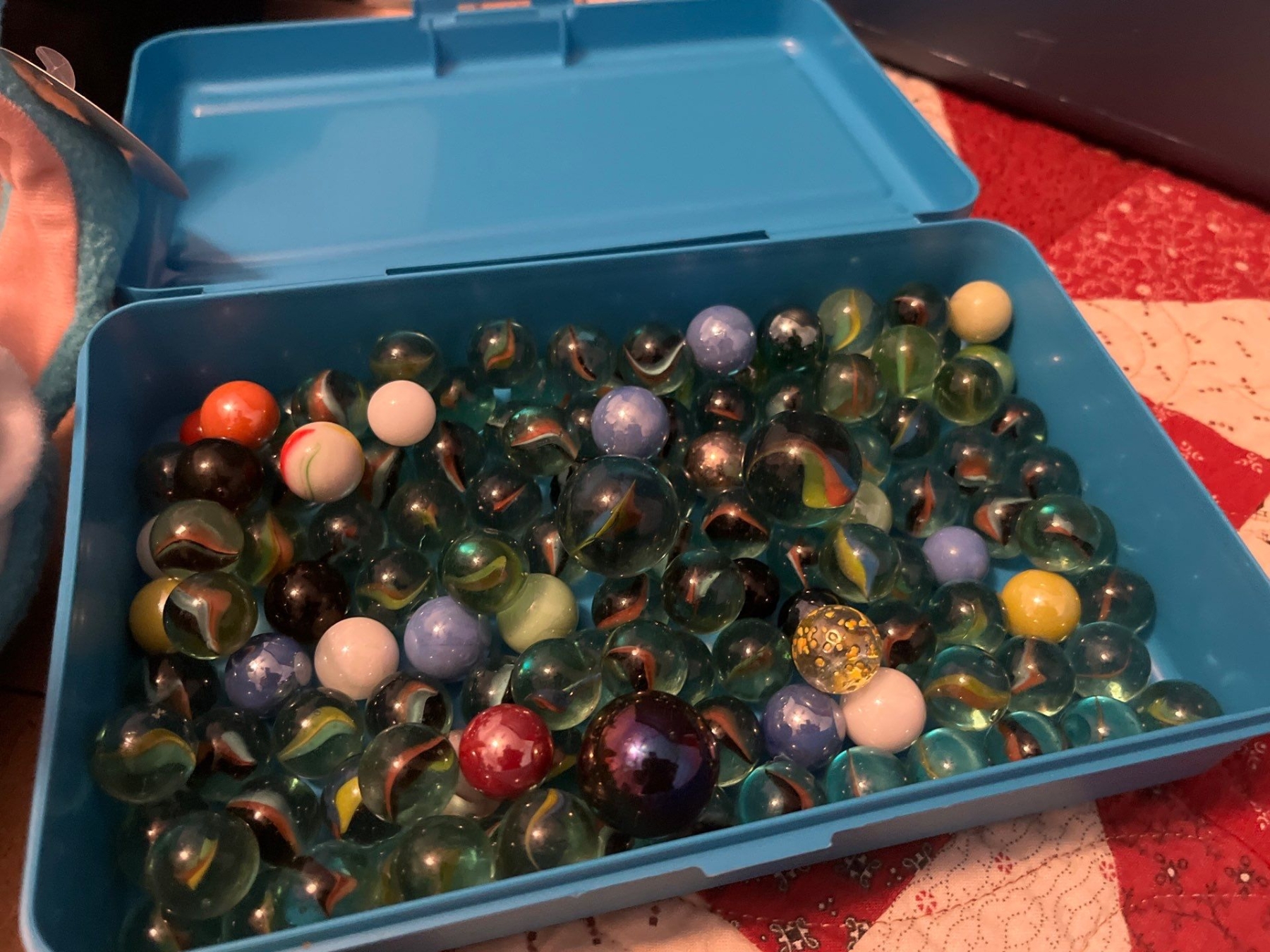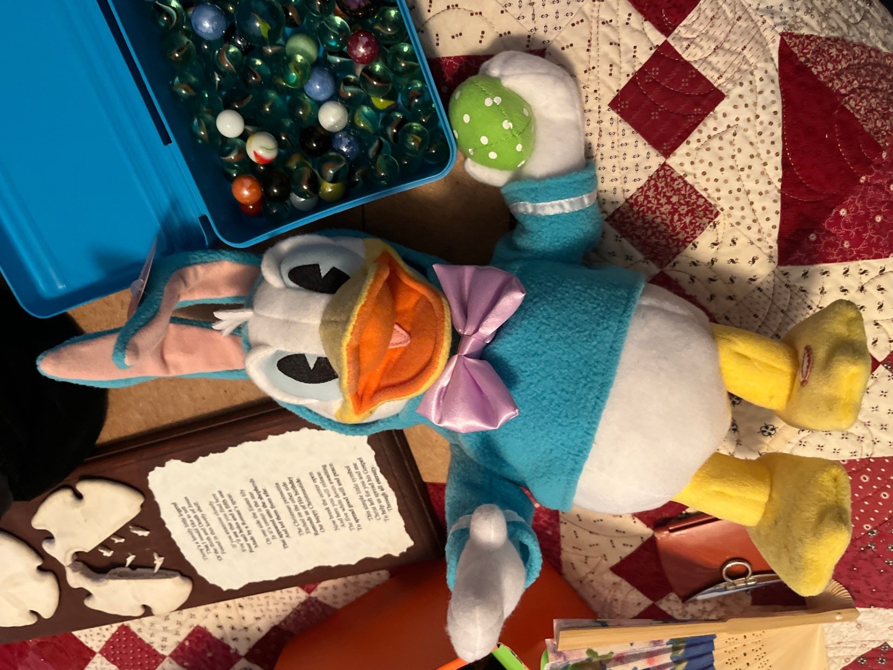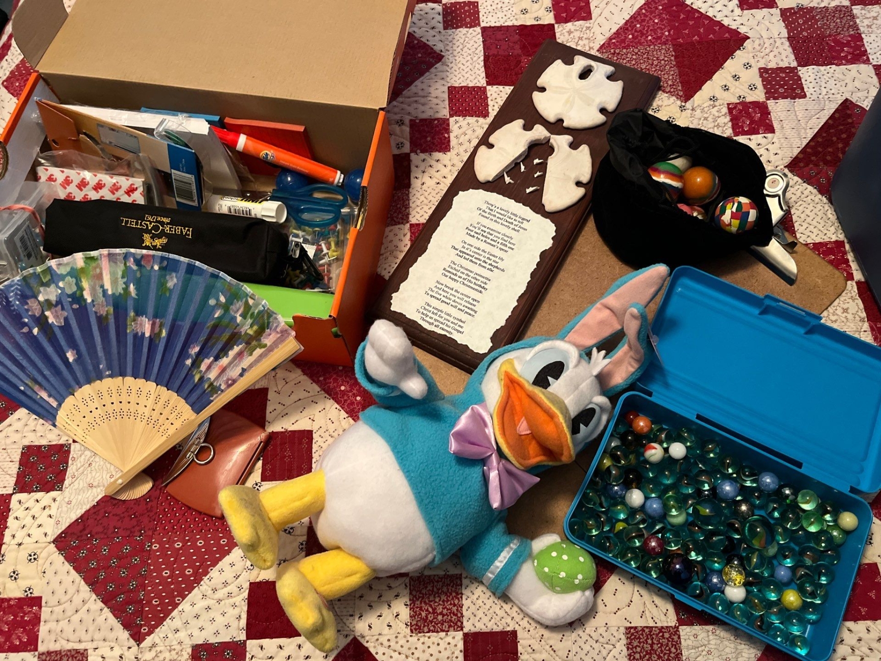 Vintage marble collection, Bouncy ball collection, art supplies and a talking Donald Duck in working condition.