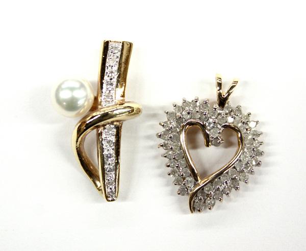 Collection of two diamond set pendants; one ''Heart'' shaped of 10k yellow gold, with diamonds, weighing 2.9 grams and one of 14k yellow gold with (1) cultured pearl and diamonds weighing 3.9 grams