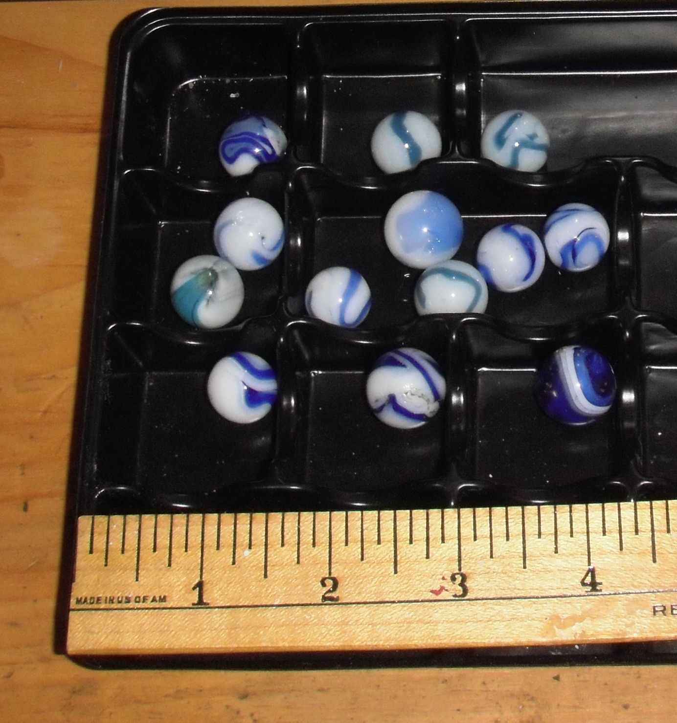 -for collectors 13 old glass marbles white with blue, 2 sizes