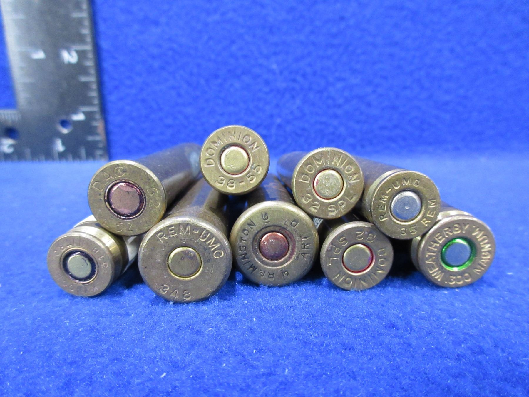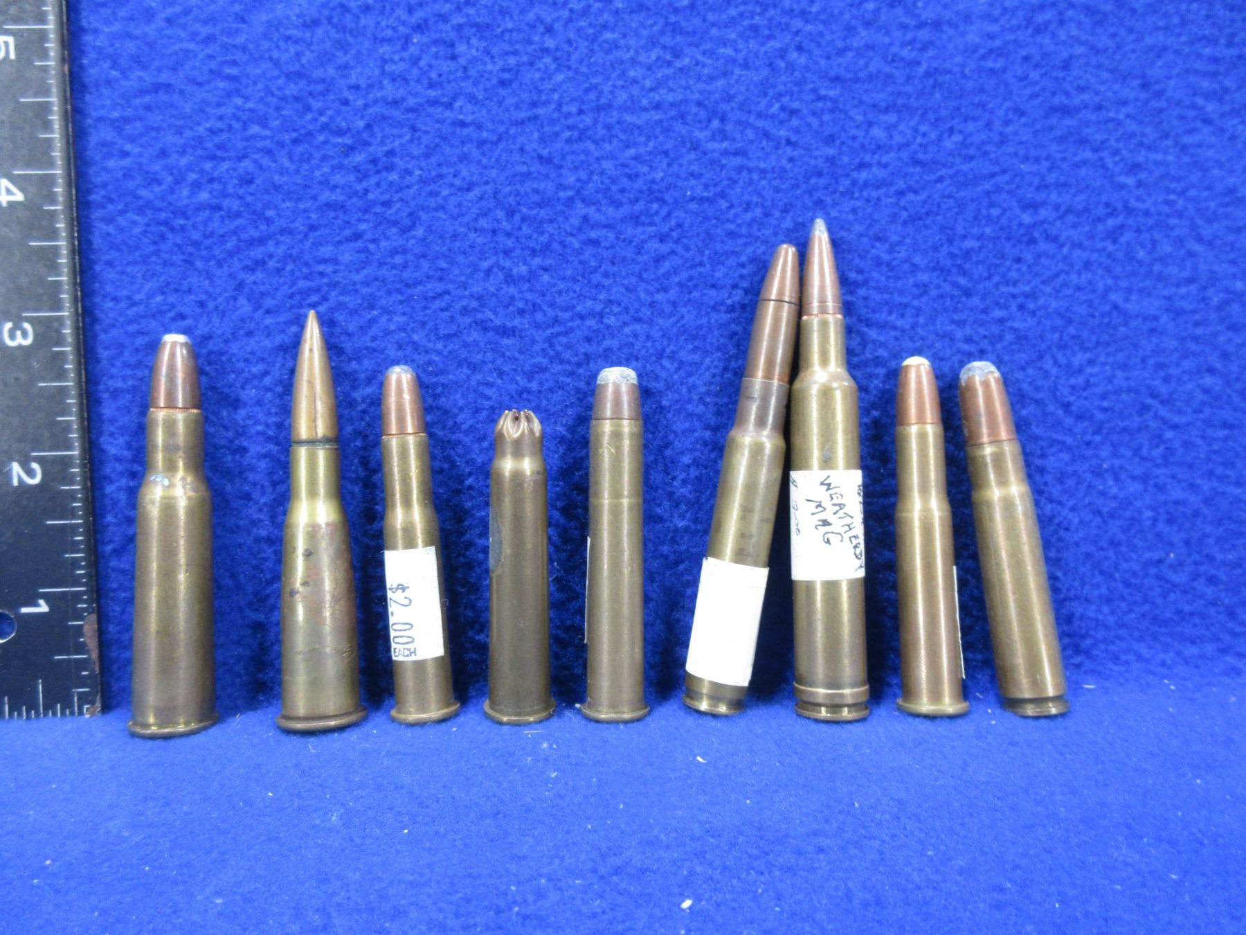 Collector Ammo - 9 Cartridges - 318 Nitro Kynoch, 348 Rem UMC, Rem Art D 3 16, 300 Wby Mag, 38-55 Dominion, 303 British Blank, 35 Rem - Rem UMC, 32 Spl Dominion x 2 - Must Ship Purolator