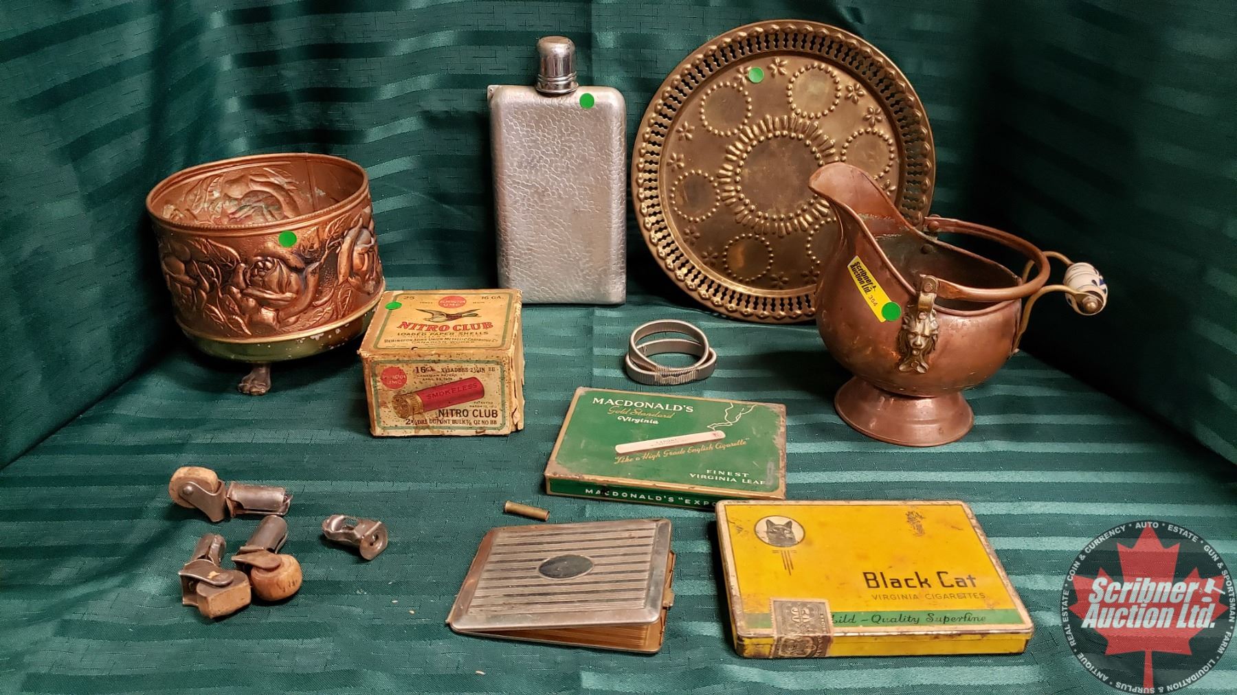 Collector Combo : Copper Pot, Cigarette Tins, Vintage Shotgun Shell Box, Flask, Gentleman's Arm Bands, etc
