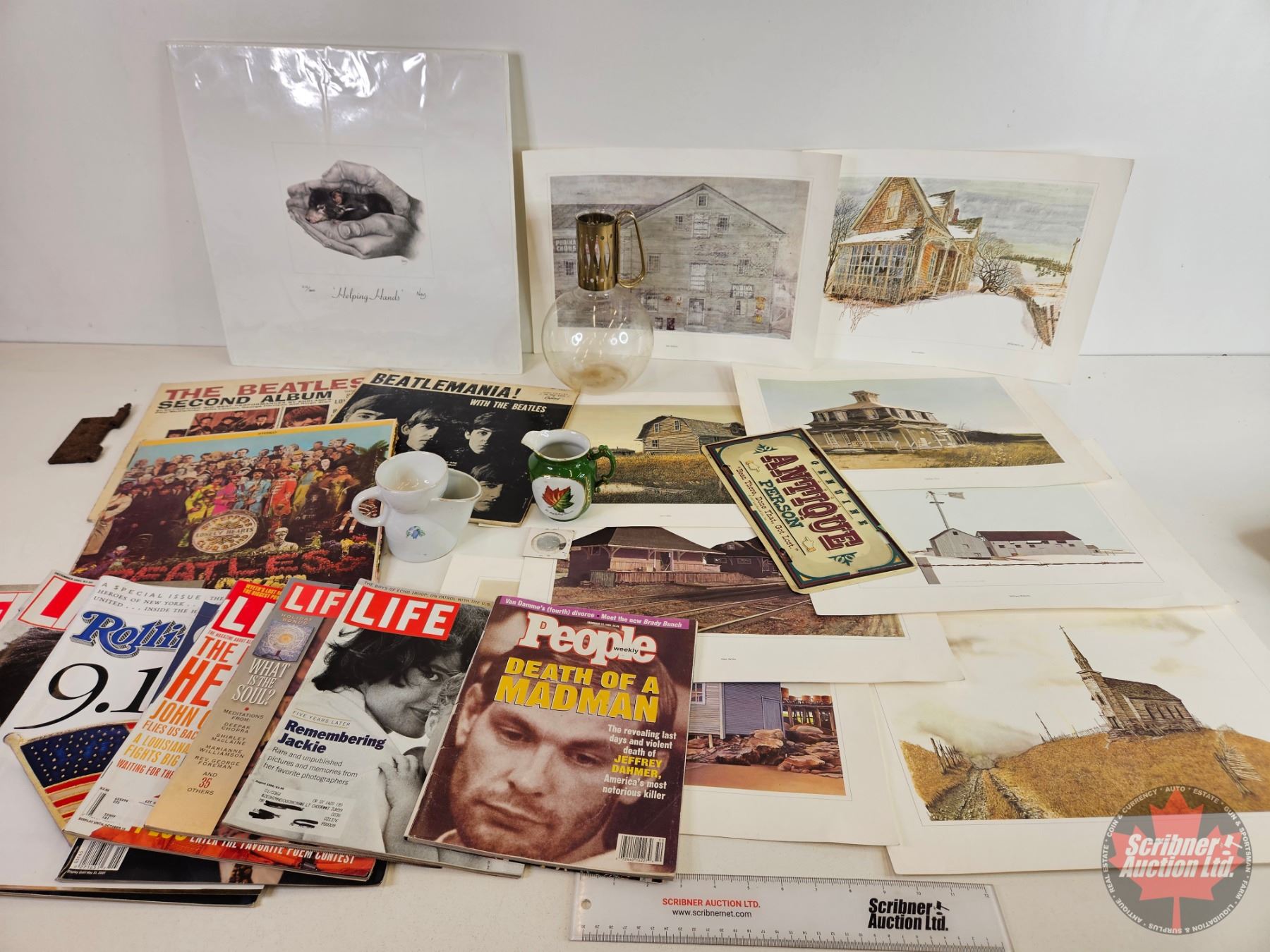 Collector Combo : Prints; Shaving Cup; Lic Plate; Magazines; Beatles Album Covers; Decanter; etc