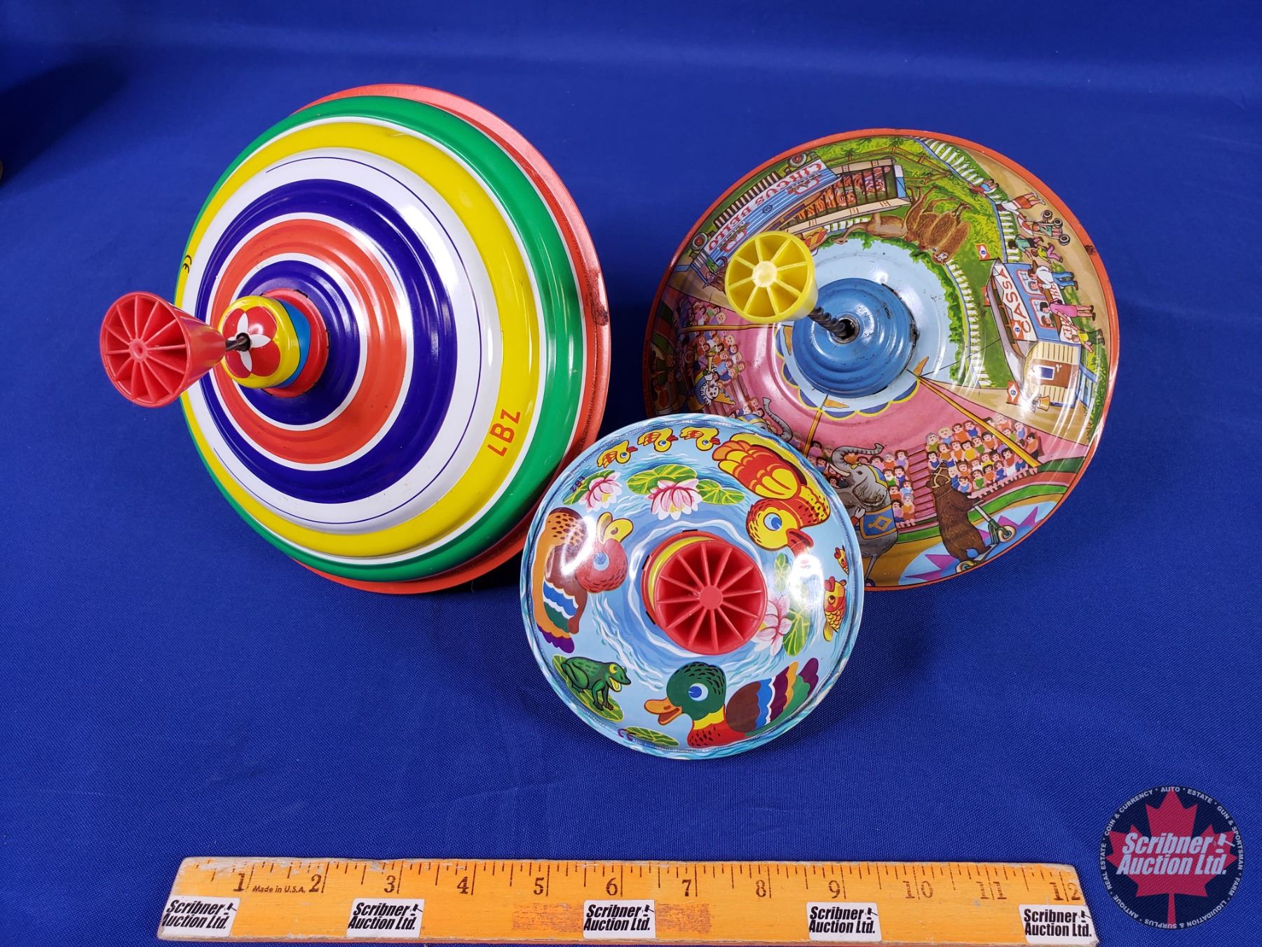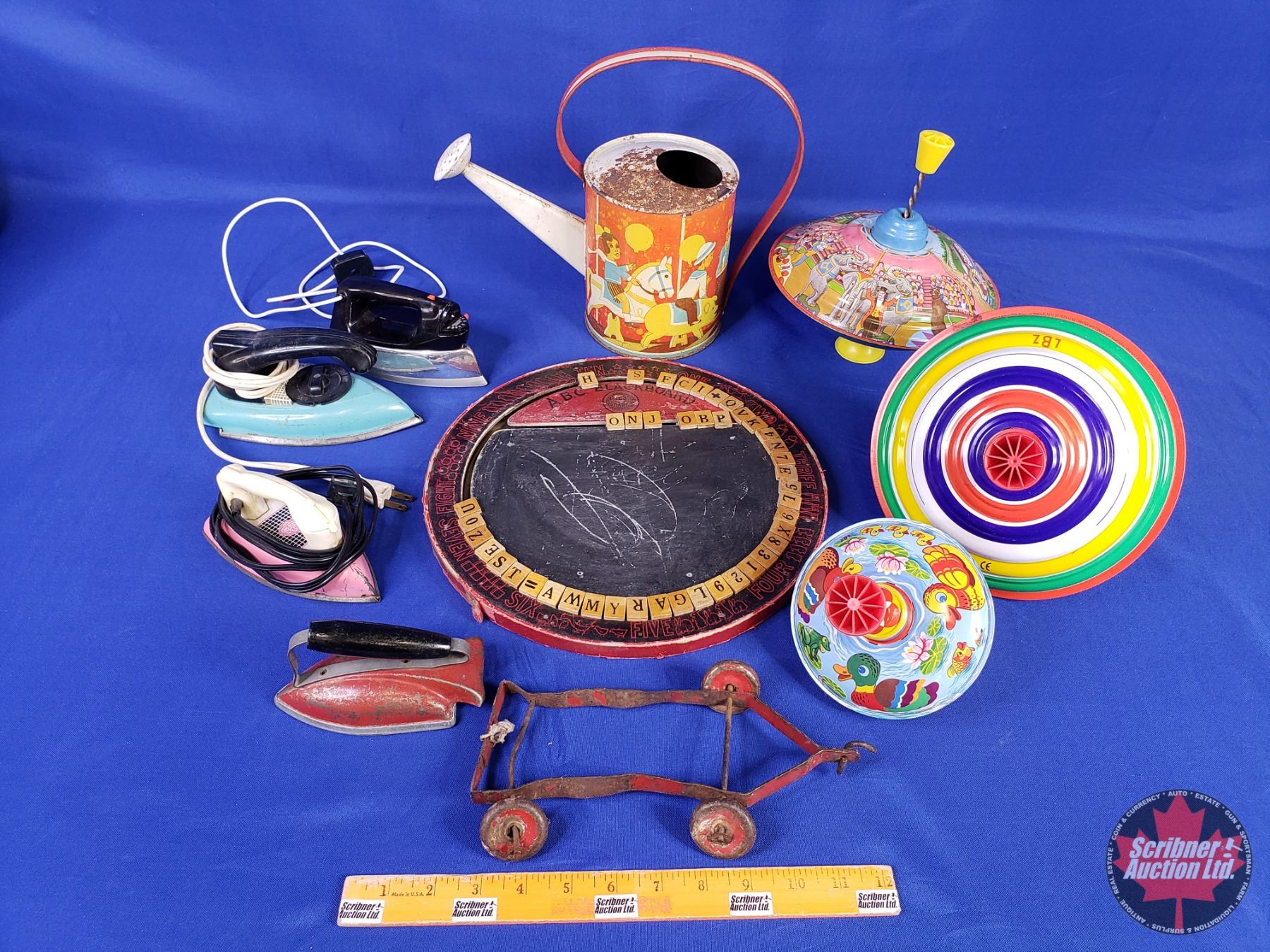 Collector Combo - Retro Childrens Items : Spinning Tops; Toy Irons; ABC Chalkboard; Watering Can; etc (Look at Photos for Makers Marks/Labels/Stampings) (SEE PICS!)