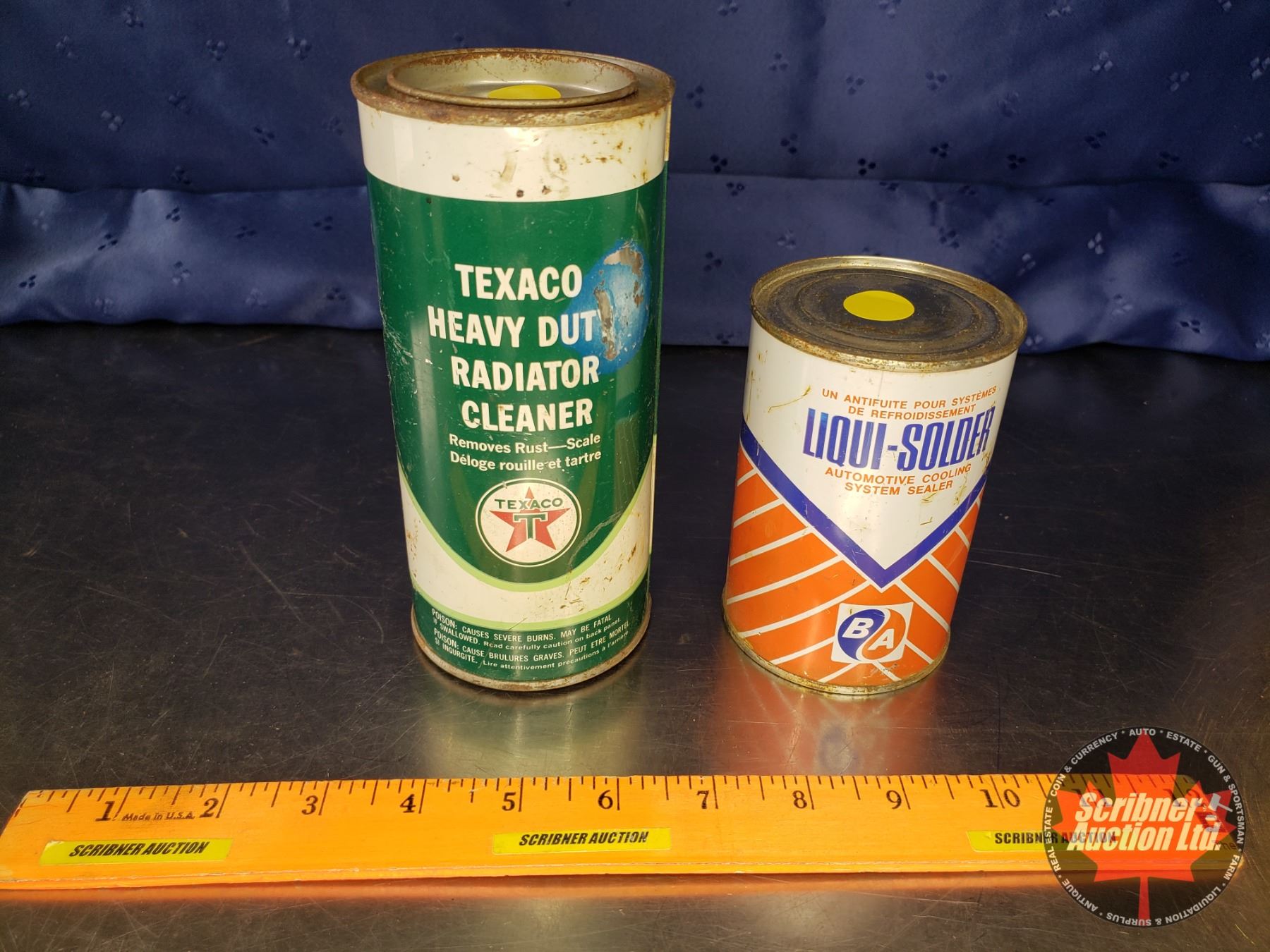 Collector Combo Tins (2) Both Full : Texaco Heavy Duty Radiator Cleaner Tin (6-1/2"H x 3"Dia) & Liqui-Solder Automotive Cooling System Sealer Tin (4-3/8"H x 2-7/8"Dia)
