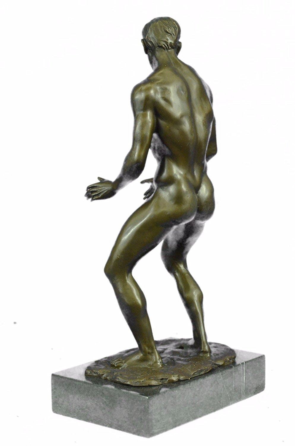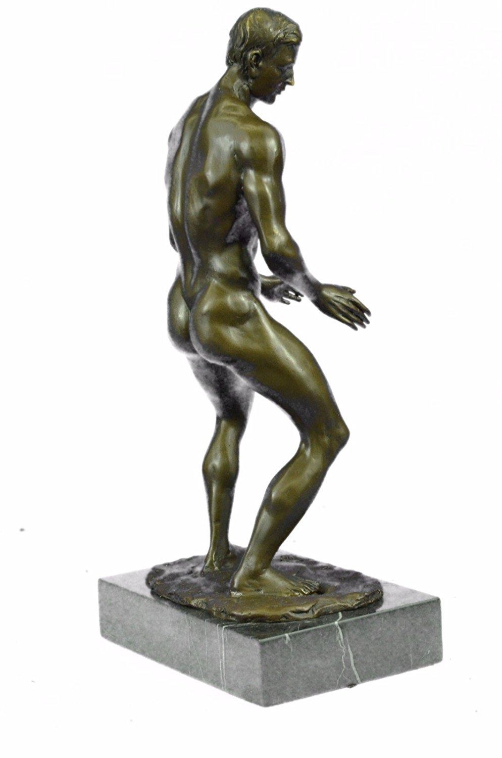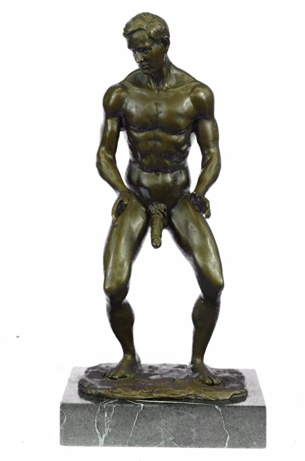 He boldly stands in the buff with a look of fearless determination.This proud gay man stretches his muscular arms in front of him and poses for his admirers. Proving he knows no shame he showcases how well endowed he is, which is Just one example of his gorgeous body. He is a lean and muscular model. Take a gander at his chiseled torso and chest. Please try not to faint. He would be right at home at New York's Chippendale's and would drive all the guys and dolls mad with desire. This confident stud was cast using the Lost Wax Method. 100% handmade bronze and carefully detailed this is a priceless unlimited edition piece of work. Bronze Dimensions with Marble Base: Height 12 X Width 6 inches. Weight: 7 LBS. Inventory: 63ST855036