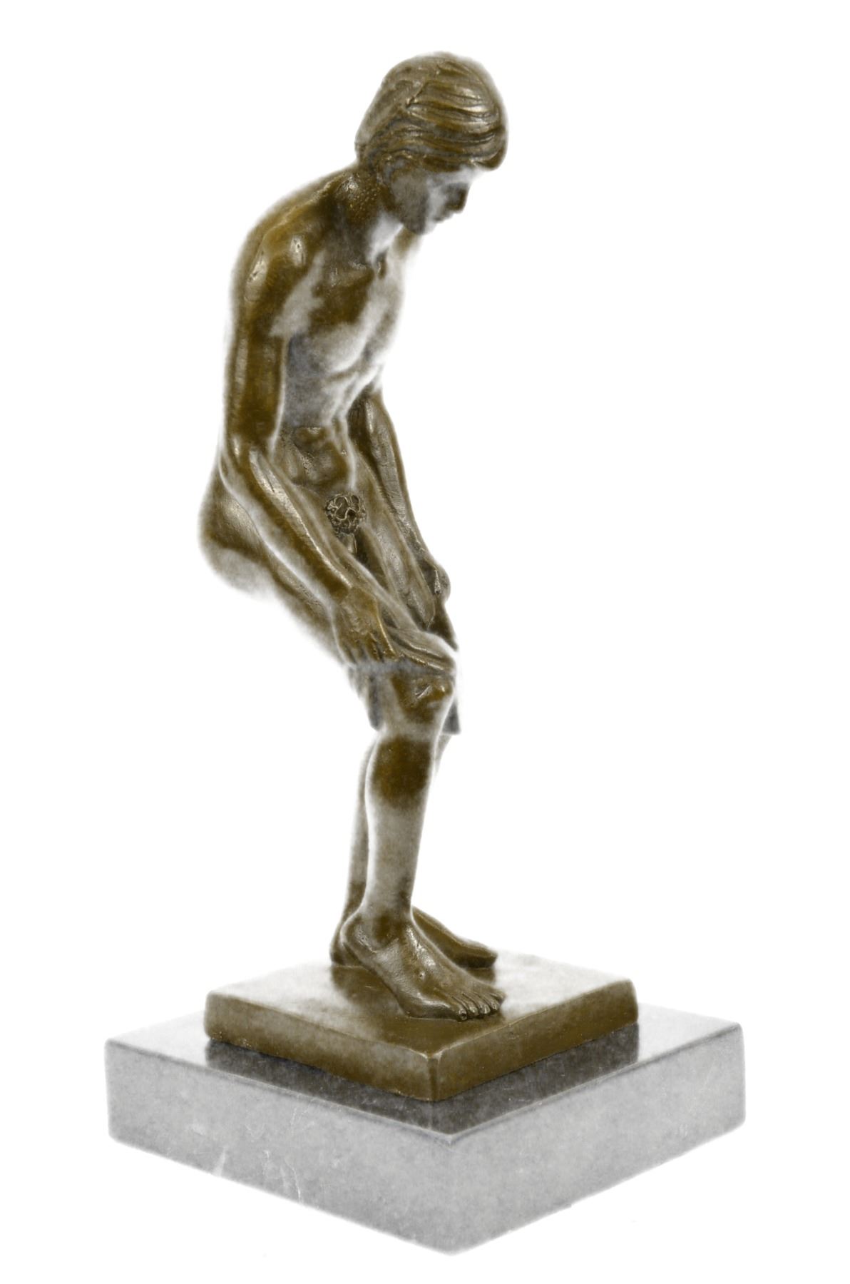 He is an artist's more like an underwear model. He stands nude as he comes out the shower and stand slouch over grabbing each end side of the underwear to slowly raise them up. Showing off his masculine, muscular body is what he does well. The detail of this sculpture is in the lines of his body. He is a symbol of strength and tranquility. This handsome nude very muscular male striking a pose in standing position is magnificent. A very worthy and quality addition to any Bronze collection. He has been photographed to the best of our abilities, but the pictures do not do him justice. Being Bronze he is suitable for home display and is definitely a wonderful conversation piece, would look great as a stand alone statue and would make a unique gift for all occasions. 100% bronze and handmade, this Hand made sculpture was cast using the Lost Wax Method. Bronze Dimensions with Marble Base: Height 12 X Eidth 5 inches. Weight: 7 LBS. Please Note: This is a reproduction bronze sculpture from the original molded and signed. This featured bronze sculpture is a recast after the original, and has been done recently. This 100% bronze sculpture is an abstract piece certain to be a conversation piece.