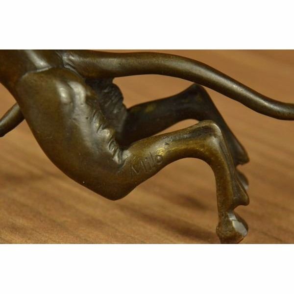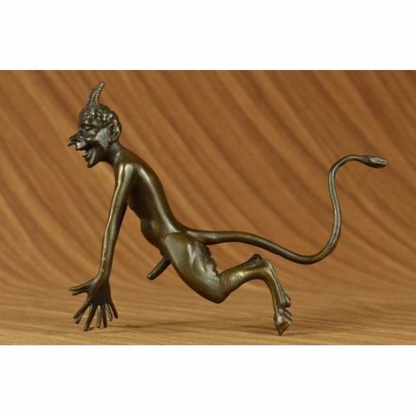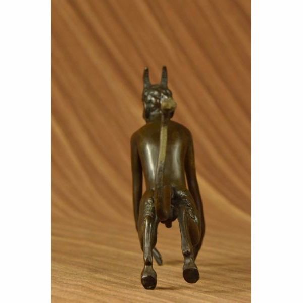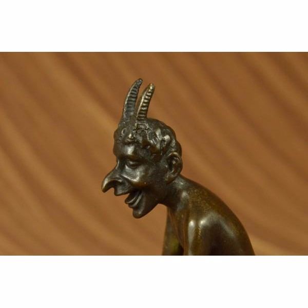 This creepy and very scary satyr is chasing around a nymph, but she is not interesting in him and his overly persisting arouse self. She is happy with her main Satyr, but has not taking no for an answer chasing her all around. His arms and hands are extended and spread out as he is trying to grab something or someone. His devil face and horns are very frightening to look at. This Satyr mythological creature could not be completely understand. This sculpture is made from solid bronze and was casted using the "Lost Wax Method". It has a brown patina for preservation and is signed Milo. Condition: This sculpture is in perfect condition. Bronze Dimensions :Height 6" x Width 8" Weight : 3 LBS Inventory :23YRD12162232