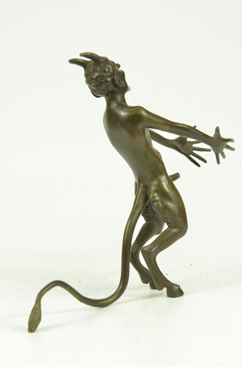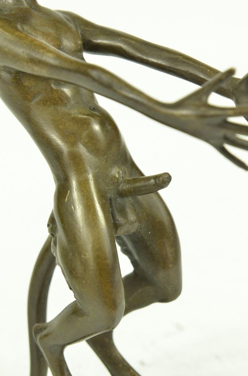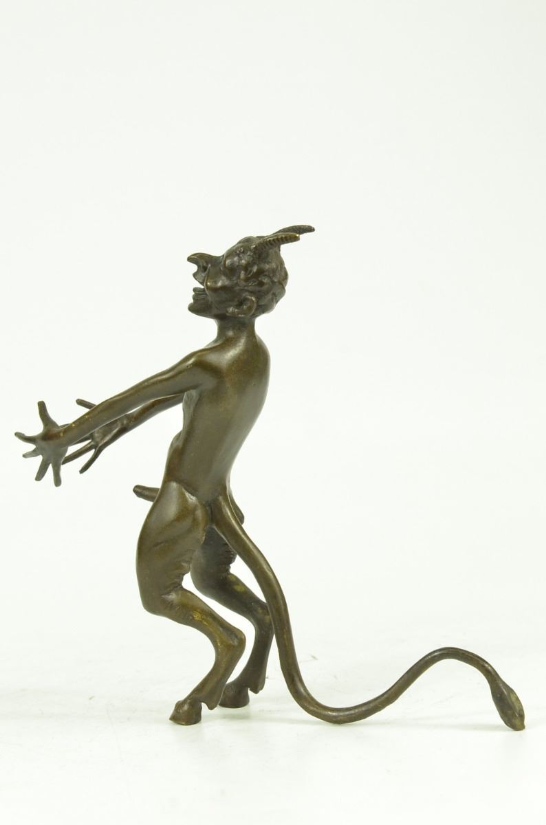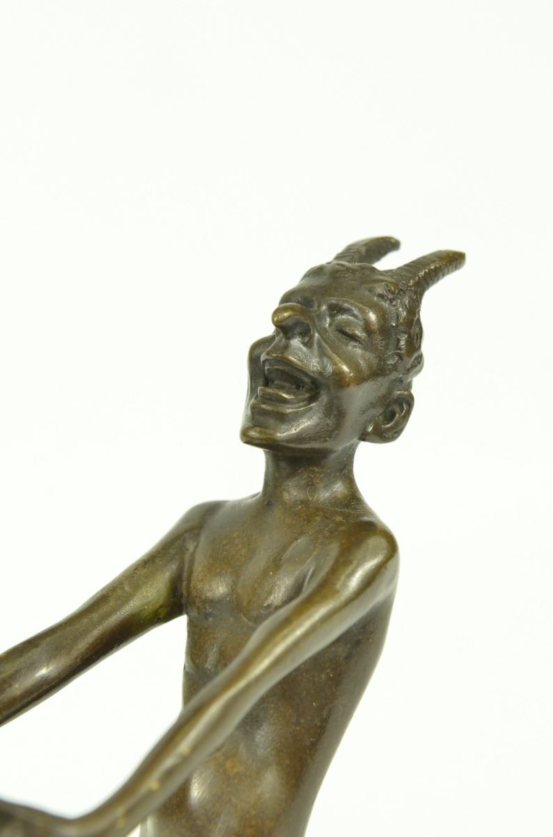 This Creepy And Very Scary Satyr Is Chasing Around A Nymph, But She Is Not Interesting In Him And His Overly Persisting Arouse Self. She Is Happy With Her Main Satyr, But Has Not Taking No For An Answer Chasing Her All Around. His Arms And Hands Are Extended And Spread Out As He Is Trying To Grab Something Or Someone. His Devil Face And Horns Are Very Frightening To Look At. This Satyr Mythological Creature Could Not Be Completely Understand. This Sculpture Is Made From Solid Bronze And Was Casted Using The "Lost Wax Method". It Has A Brown Patina For Preservation And Is Signed Milo. Bronze Dimensions: Height 6 X Width 8 inches. Weight: 3 Lbs.
