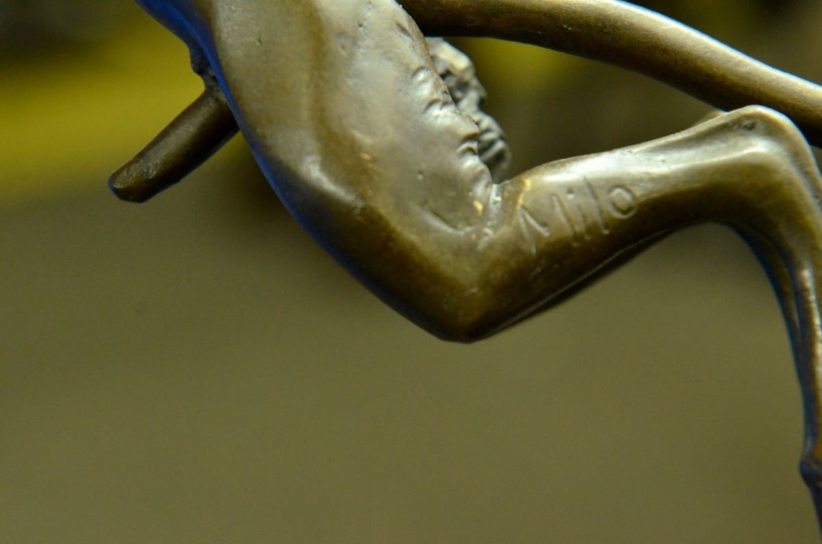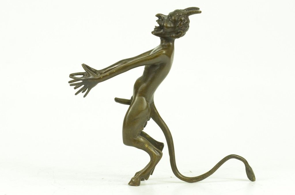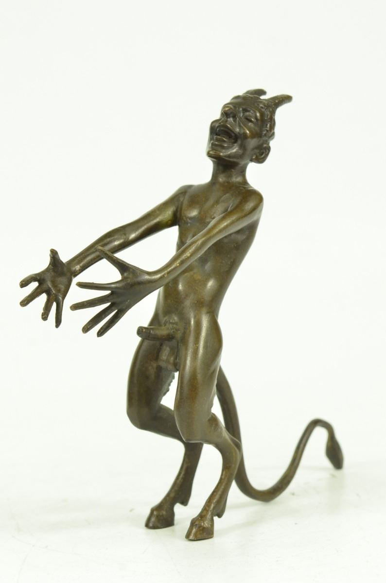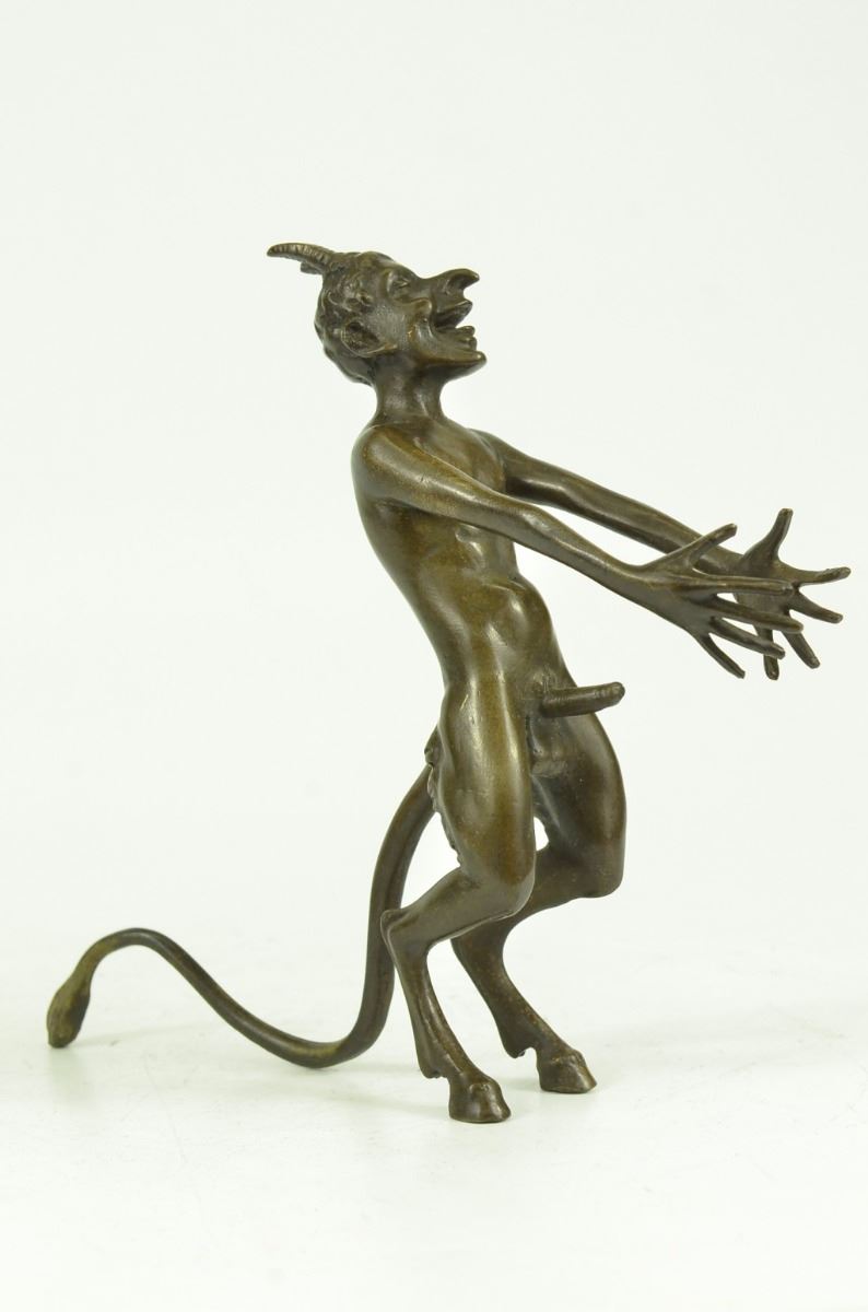 This Creepy And Very Scary Satyr Is Chasing Around A Nymph, But She Is Not Interesting In Him And His Overly Persisting Arouse Self. She Is Happy With Her Main Satyr, But Has Not Taking No For An Answer Chasing Her All Around. His Arms And Hands Are Extended And Spread Out As He Is Trying To Grab Something Or Someone. His Devil Face And Horns Are Very Frightening To Look At. This Satyr Mythological Creature Could Not Be Completely Understand. This Sculpture Is Made From Solid Bronze And Was Casted Using The "Lost Wax Method". It Has A Brown Patina For Preservation And Is Signed Milo. Bronze Dimensions: Height 6 X Width 8 inches. Weight: 3 Lbs.