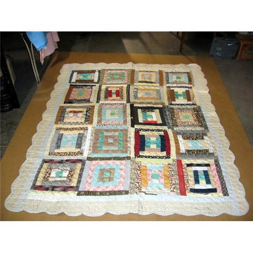 We have for sale a multi-color Log Cabin Quilt. It is hand quilted with 6 stitches per inch. It is machine pieced and was made from silk scraps. The scalloped edge border is gray and beige. The backing is beige color. There are several pieces aged and raveling. There are a few brown stains on the back and blue areas faded from the front to the back. The measurements are 80 1/2" long by 67" wide and weighs 4 Pounds. We will be able to ship to Canada and some oversea countries.
