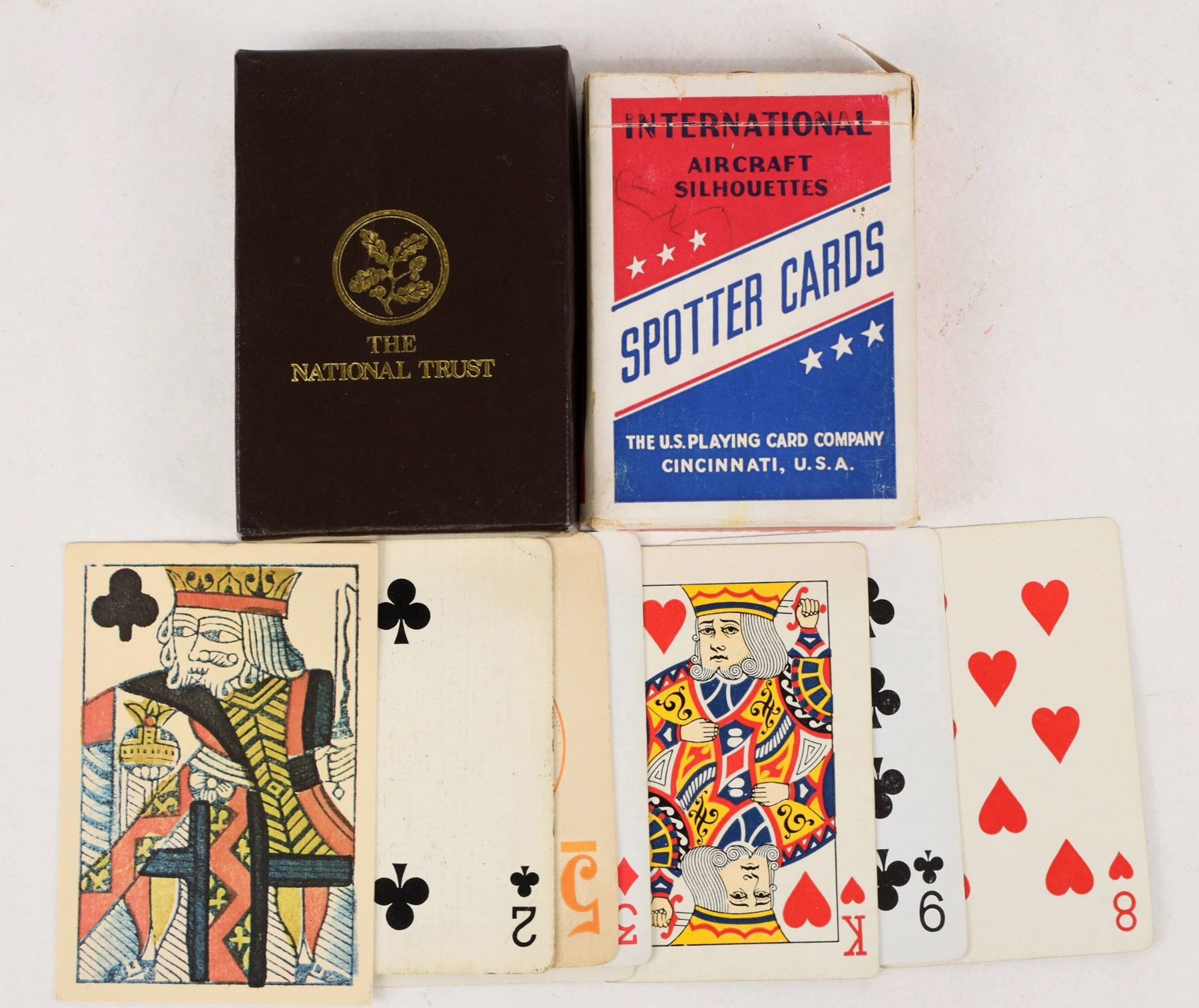 A group of two decks and a few separate single cards of a collectible nature from playing card decks. The best may be the "spotter cards" of international aircraft silhouettes from the ww2 era. a second deck is a Coca-Cola deck, missing a couple cards. six to eight single cards accompany the pair of decks.