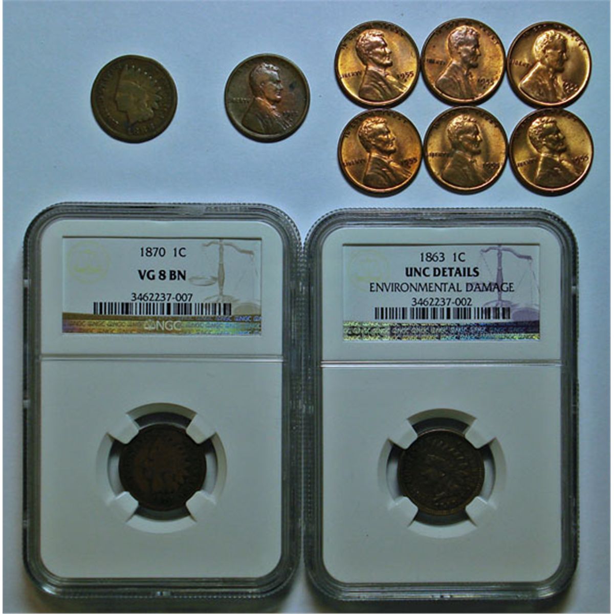 damage,1870 NGC08,1888,Lincolns 13D VG and 5 unc 55s
