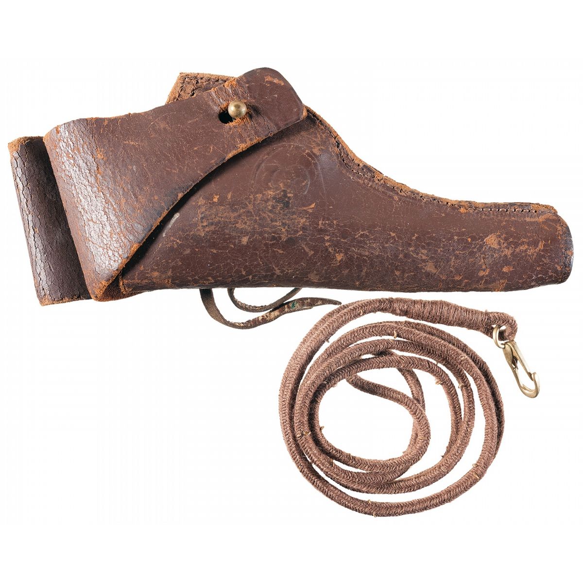 Very fine, with 70% of the original blue finish, showing areas of brown patina, bright edge wear, and light spotting and handling marks overall. The grips are very good, with light dents. The holster is fair, with extensive cracking, lost stitching, an absent plug, and scuffs. Mechanically excellent.
