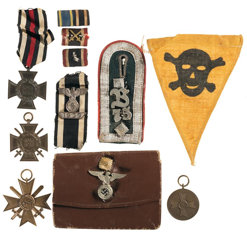 1) Yellow mine flag with skull. Good. 2) Round war merit medal. Very good, no ribbon. 3) 1 artillery NCO shoulder board. Good. 4) 3 unknown cloth badges. 5) War merit cross with swords. Good, no ribbon. 6) Hindenburg cross. Good, no ribbon. 7) 1914 Iron Cross ribbon with 1939 repetition clasp. Good. 8) Iron Cross medal marked "1914/1918" on the front and "43/R.V./PFORZHEIM" on the back. 9) Vinyl money pouch with Nazi pins.