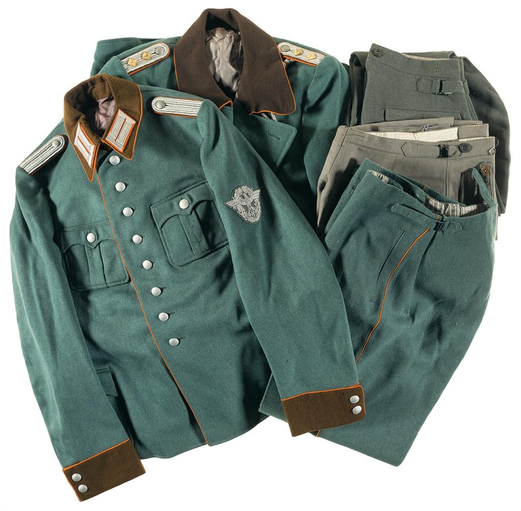1 Green tunic with brown collar and sleeve cuffs with orange piping. There is a "WILHELM THIELE, MUNCHEN/Karlstr. 27" label inside the pocket hand dated 1941. Has silver bullion officer's litzen and brown and orange shoulder boards with silver bullion. 1 pair of green pants with orange piping with a "WILHELM THIELE, MUNCHEN/Karlstr. 27" label on the inside that is hand dated 1941. 1 overcoat that has a brown collar with orange piping. The shoulder boards are brown and orange with silver bullion and two gold pips. 1 pair of dark green/gray pants without a visible label. 1 pair of gray pants with a "FRIEDER. WITTMANN/NURNBERG" label on the inside that is hand dated 1945.