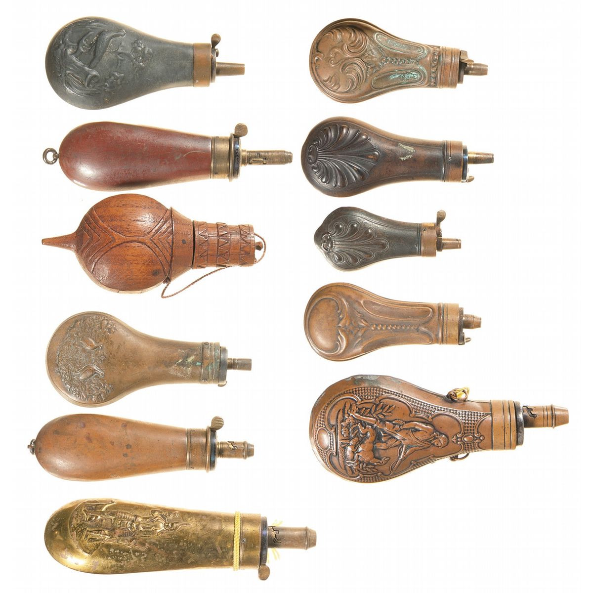 Double face hunting scene flask. 2 double face shell flasks. 2 double face game bird scene flasks. Bag shaped double face hunter scene flask. 2 J. Dixon plain bag shaped flaks. Carved wooden flask. 2 double face ornate pattern flask. Overall good to very good.