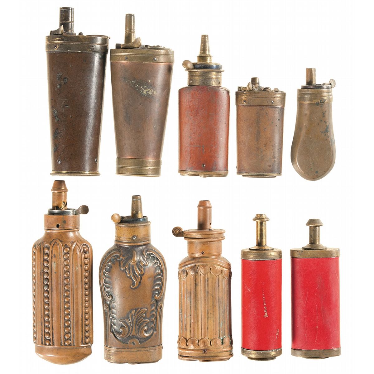 2 red flasks. 5 plain flasks. Double face dot and groove pattern flask. Double face ornate floral pattern flask. Double face grooved flask.