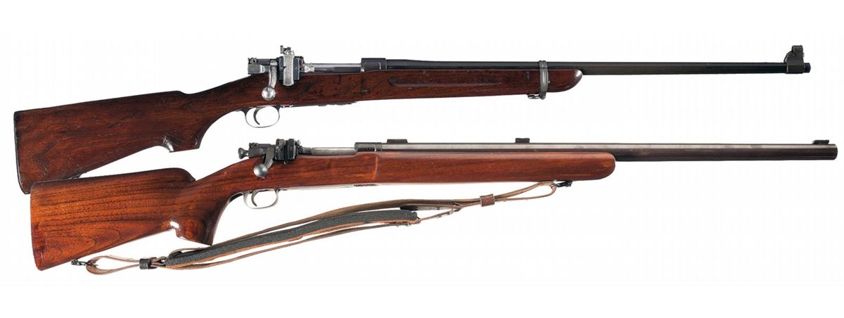 - B) Manufactured circa 1920 and subsequently outfitted for target shooting. The heavy barrel is marked "J.R. BUHMILLER" and has a sight block at the muzzle and two scope blocks near the rear with 7.2 inch spacing. There is a Lyman rear peep sight base mounted on the right rear of the receiver. Mounted on a walnut target style pistol grip stock with wide forearm, raised cheekpiece, sling swivels and a decorative diamond inlaid in front of the floorplate. The barreled action has been bedded to the stock. With a leather claw sling and a slip on sling pad.