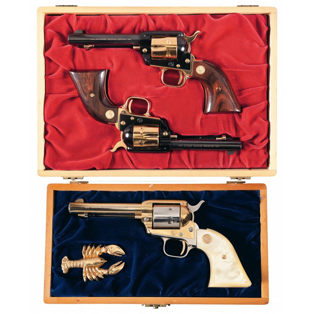 A) Has the standard markings and features of this commemorative. Fitted with smooth walnut grips with gold Colt medallions. With a wooden case lined in red fabric that houses "A" and "B" of this lot. Consecutively serial numbered to "B".