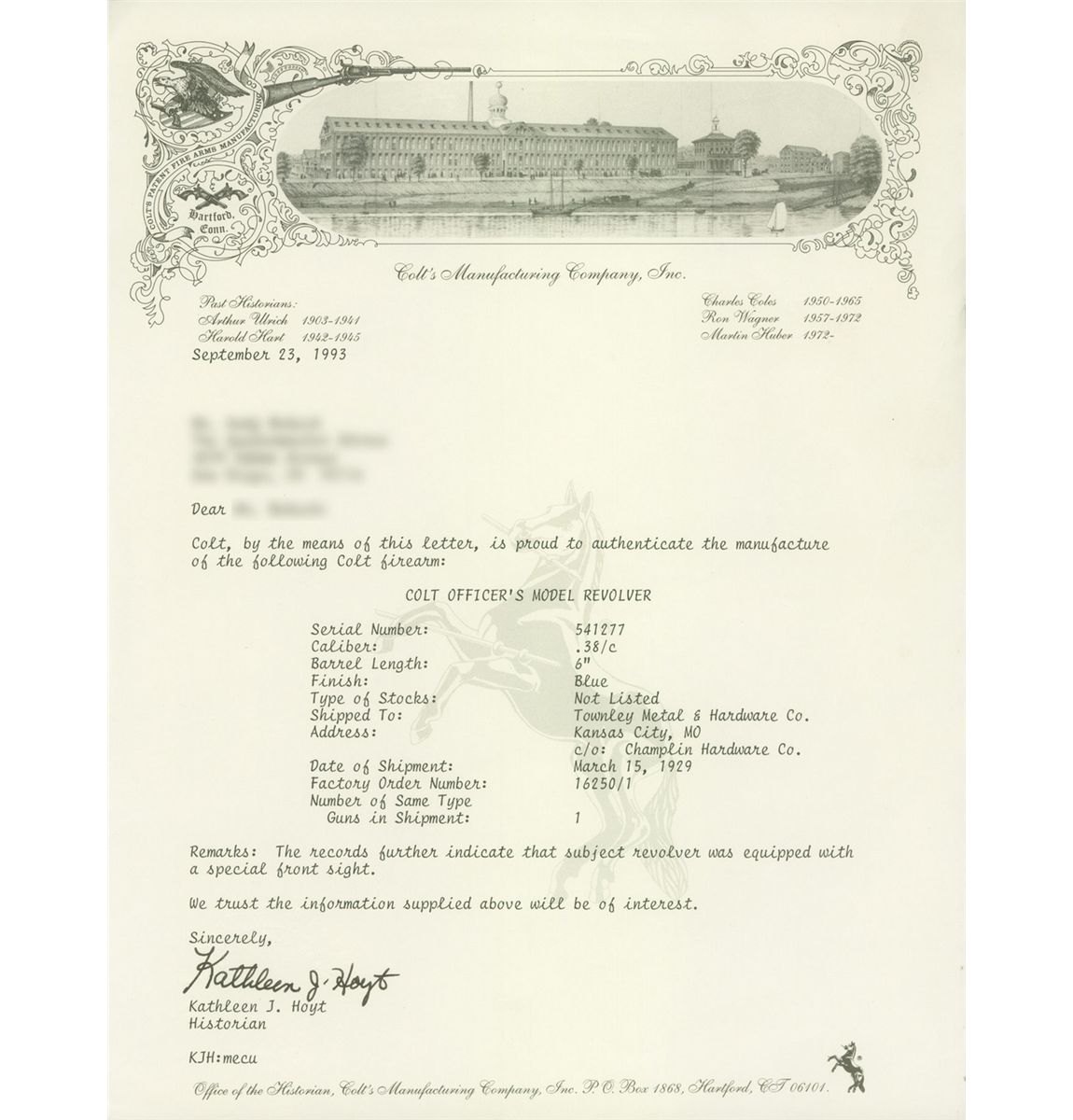 Cold blued cylinder. With Colt letter verifying configuration, grips as "Not Listed", and shipment to Kansas City, Mo. on March 15, 1929.