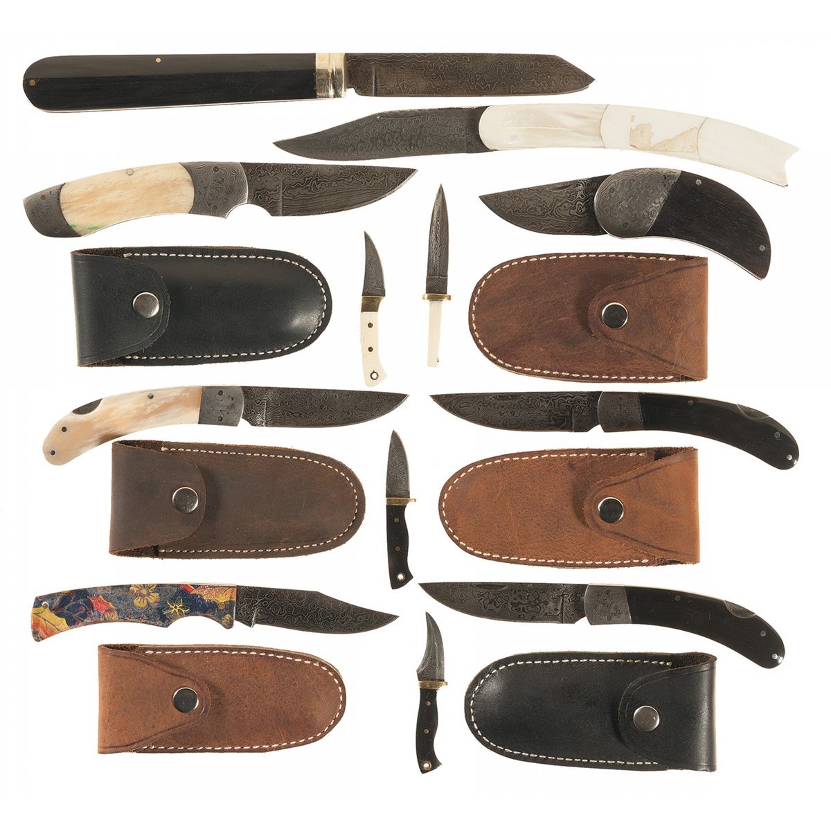 1) 1 1/4" blade with synthetic scales and 3" OAL. Excellent. 2) 2" blade with bone grip and 3 1/2" OAL. Excellent. 3) 1 1/4" blade with synthetic scales and 3" OAL. Excellent. 4) 1 1/4" blade with bone scales and 3" OAL. Excellent. 5) Slip joint knife with 4 3/4" blade, synthetic scales and 10 3/4" OAL. Excellent with a few small areas of discoloration and spotting. 6) Spine lock knife with 3 1/8" blade, synthetic scales and 7" OAL. With sheath. Excellent overall with minor handling marks. 7) Slip joint knife with 3 1/4" blade, bone scales and 7 1/2" OAL. With leather sheath. Excellent with only minor handling marks. 8) Spine lock knife with 3 1/4" blade, synthetic scales and 7" OAL. With leather sheath. Excellent with minor handling marks and light spotting. 9)Slip joint knife with 4" blade, pearl scales and 10" OAL. Very good with some wear and some chipping of the pearl. 10) Slip joint knife with 3" blade, clear acrylic scales with bright multi-color metallic flower design and 7" OAL. With leather sheath. Excellent with only minor wear on the acrylic scales. 11) Spine lock knife with 3 1/8" blade, bone scales and 7" OAL. With leather sheath. Excellent with minor marks. 12) Slip joint knife with 2 1/4" blade, hardwood scales and 5 3/4" OAL. With leather sheath. Excellent with minor marks.