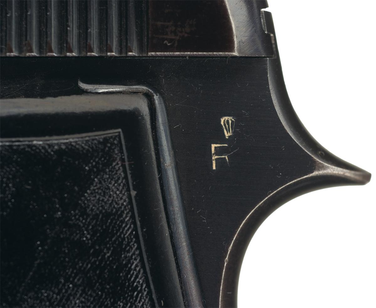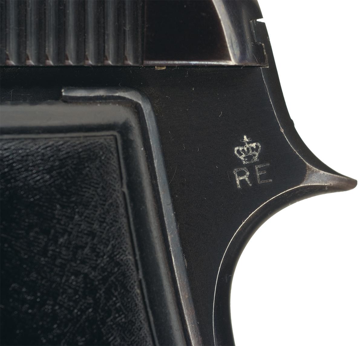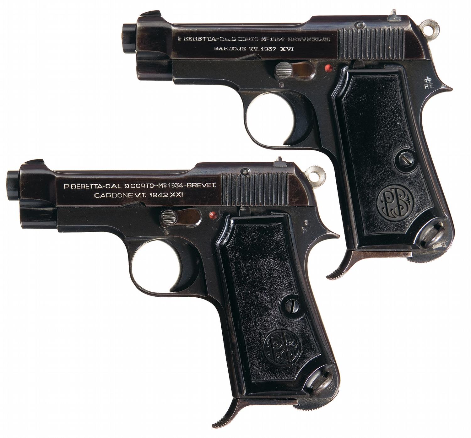 A) The left side of the slide is marked "P. BERETTA-CAL.9 CORTO-Mo 1934-BREVETETTATO / GARDONE V.T. 1937 XVI". The left grip tang has the Italian Army crown over RE marking. Fitted with metal backed black plastic grips with "PB" emblem. Matching serial number on frame and slide.