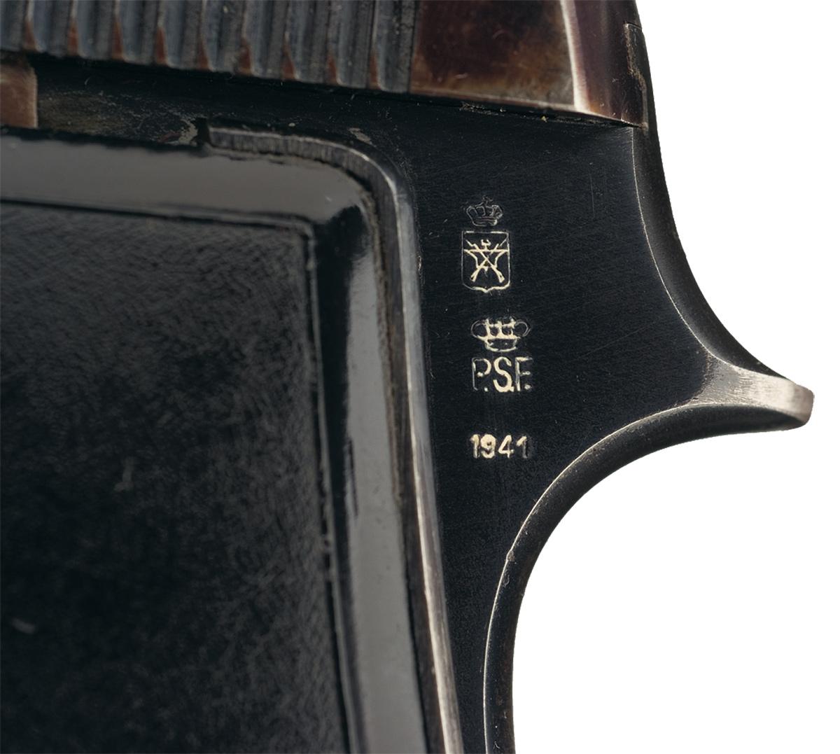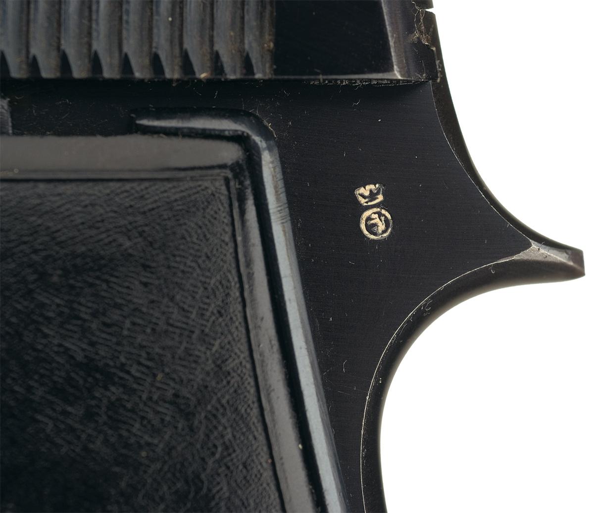 A) This Romanian contract pistol is identical to the Model 1934 with the following slide legend: "P. BERETTA-CAL. 9 SCURT-Mo 1934-BREVET. / GARDONE V.T.-1941". The left grip tang is stamped with 1941 dated Italian commercial proofs. Matching serial number on slide and frame. Fitted with standard "PB" emblem grips.