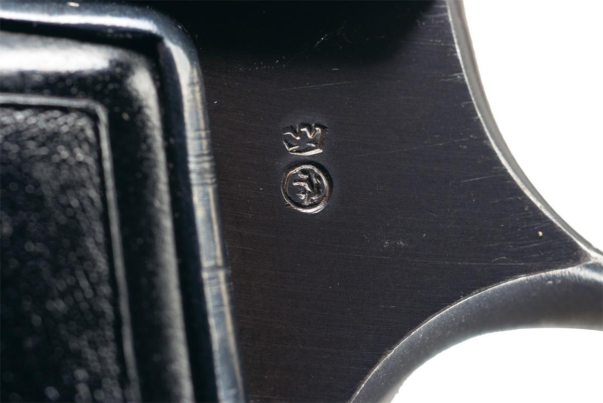 Condition: Fine as partially refinished. The slide retains 80% blue finish with the balance a cold blue touched up smooth gray patina with limited pin point pitting. The frame retains 90% blue finish with a smooth brown patina on the grip straps. The moderately worn grips are very good with some minor wear on the right grip panel and some scattered minor scratches.