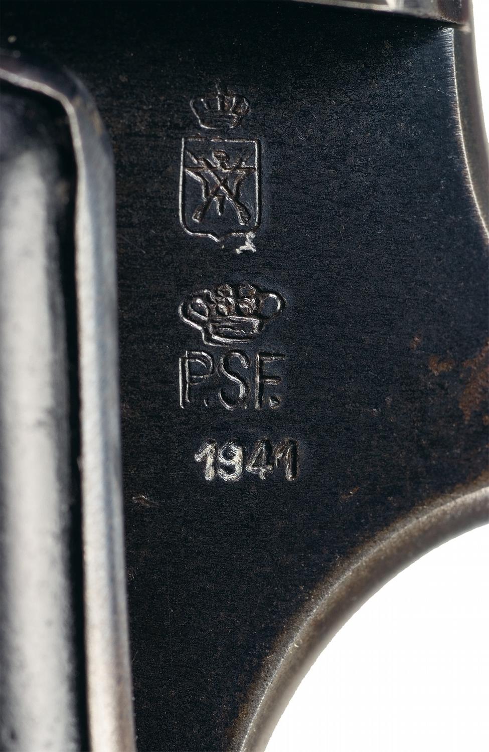 The left side of the slide is stamped "P. BERETTA-CAL. 9 CORTO-Mo 1934-BREVET. / GARDONE V.T. 1941 XIX". The left grip tang is stamped with 1941dated Italian commercial proofs. The right grip tang is stamped "GECO", the commercial marking for Gustav Genschow & Co., Hamburg, Germany. German officers were required to privately purchase their own side arms. Fitted with standard metal backed plastic grips with "PB" emblem.