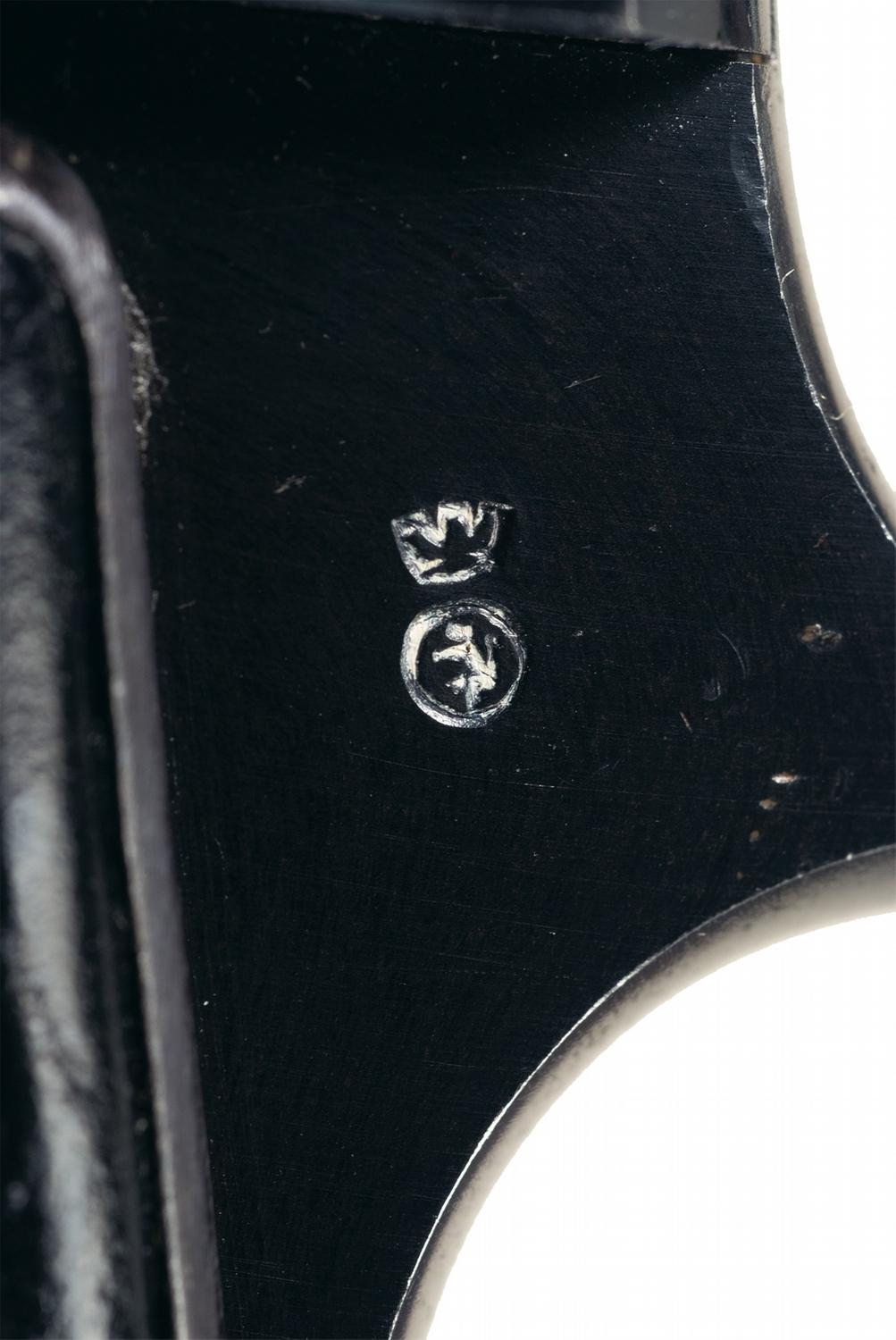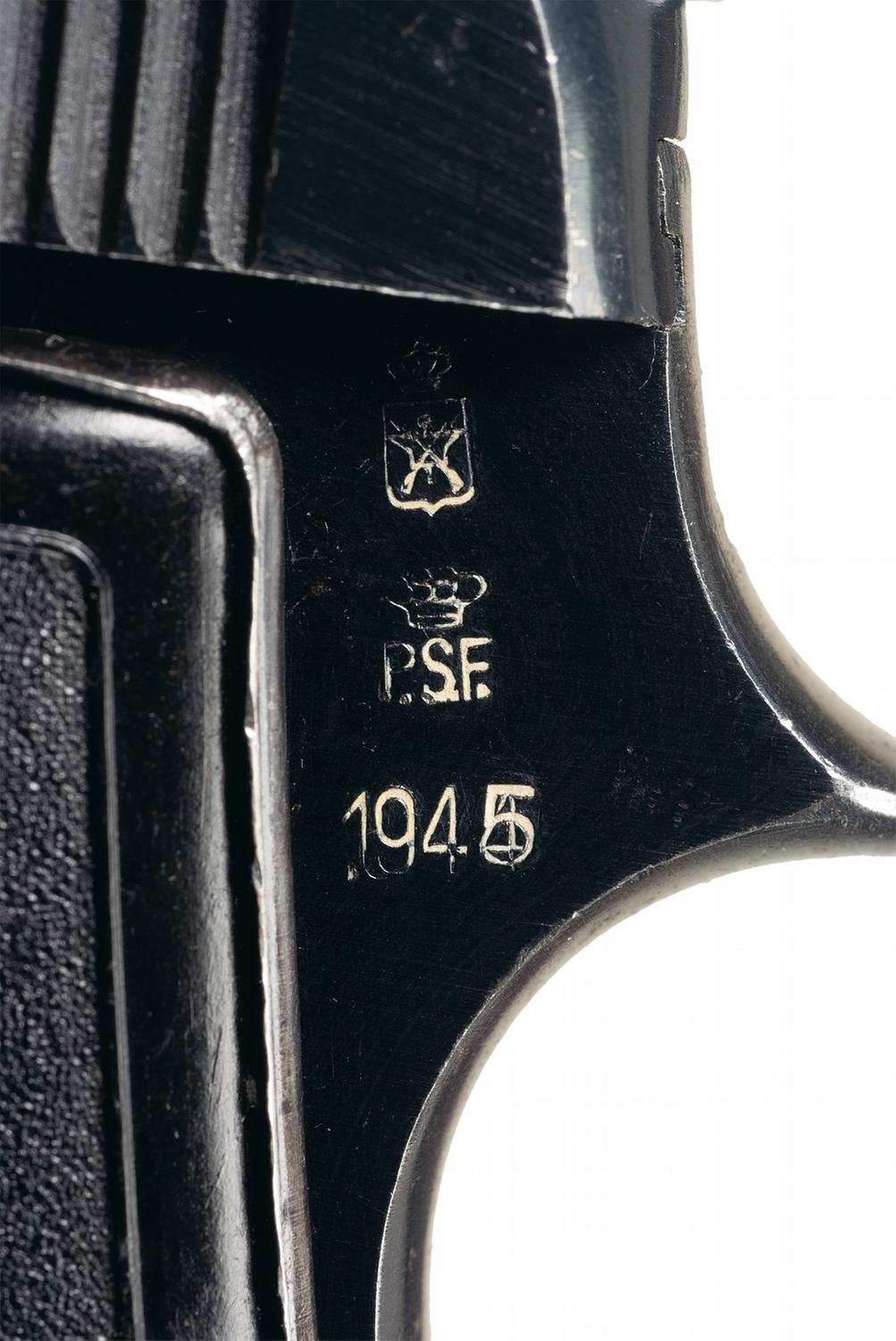 A) Highlighted in white, "P. BERETTA-GARDONE V.T. / CAL. 9C" is marked on the left side of the frame, with 1945 (with the "5" in date struck over the "4") dated Italian commercial proofs stamped on the left grip tang. The top of the barrel has the caliber marking and a British proof. A pair of British proofs are stamped on the right side of the frame, with a single British proof on the slide. Fitted with the standard metal backed plastic grips with "PB" emblem. This pistol (9585BB) was reportedly delivered to the German Army in 1945 by the Beretta factory.