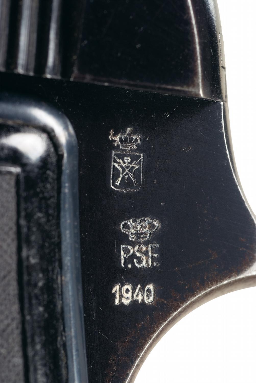Condition: Excellent. The pistol retains 90% original high polished blue finish with some minor edge wear, a few minor scratches, and a mixed brown patina on the grip straps. The grips are also excellent with a few minor handling marks. Mechanically excellent.