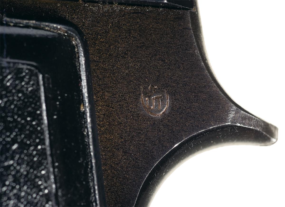 Condition: Very fine. The slide retains 90% original blue finish with the remaining finish turned to a purple hue with some minor edge wear. The frame retains 75% blue finish thinning to a brown patina with a smooth gray patina on the grip straps. The grips retain some blue finish in the protected areas with the balance a smooth gray patina. Mechanically excellent.