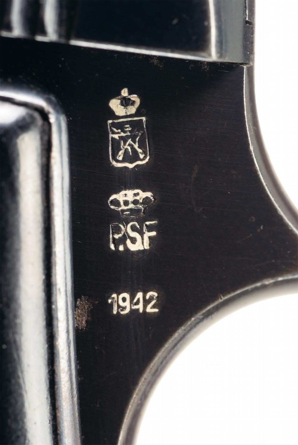 A) The slide has the two line Beretta legend with the date "1942 XX". The left grip tang has 1942 dated Italian commercial proofs. The boxed "SA" Finnish Army property markings appear on the left side of the frame and on the magazine base. Standard grips with "PB" emblem.