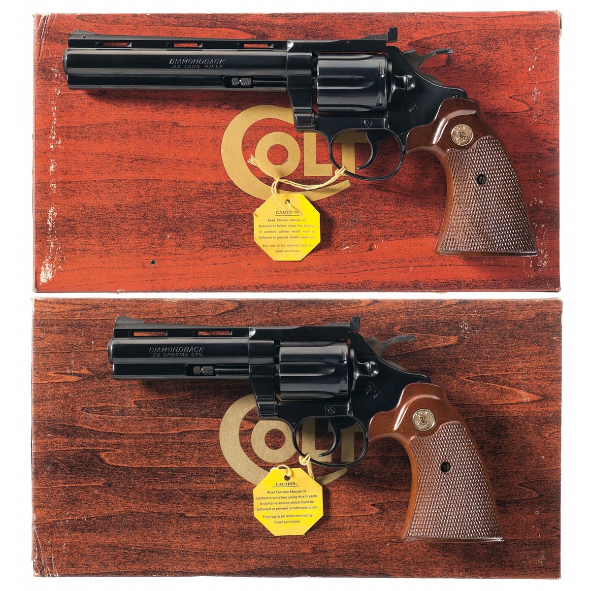 A) Manufactured in 1990 with the standard markings and features. Fitted with a set of checkered walnut grips with gold Colt medallions. With box numbered to gun.