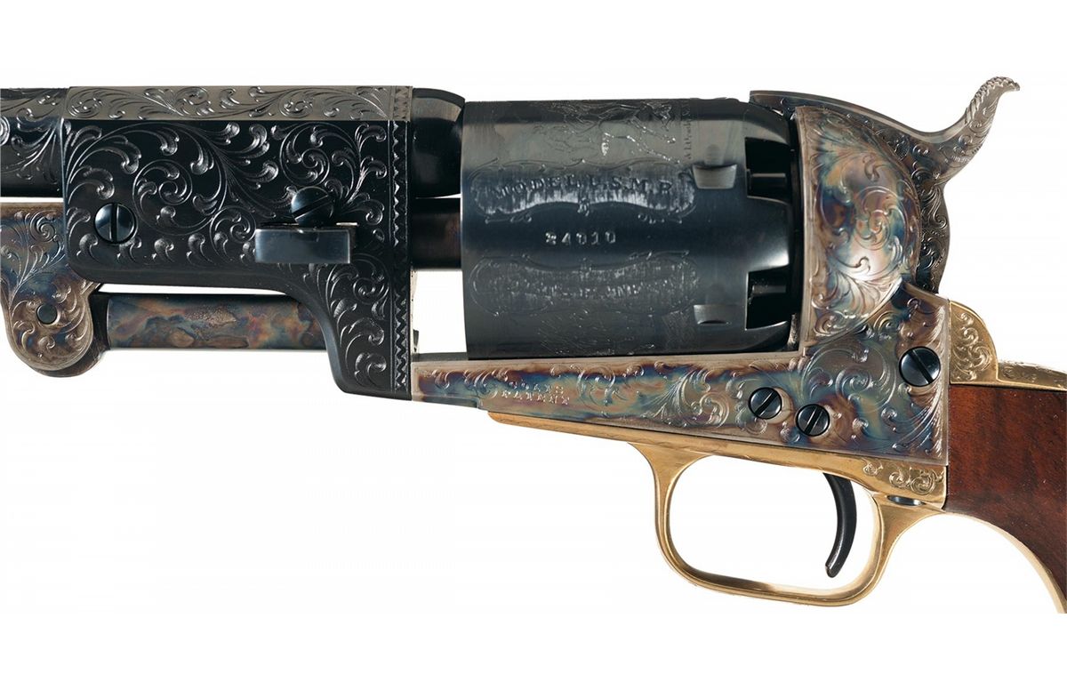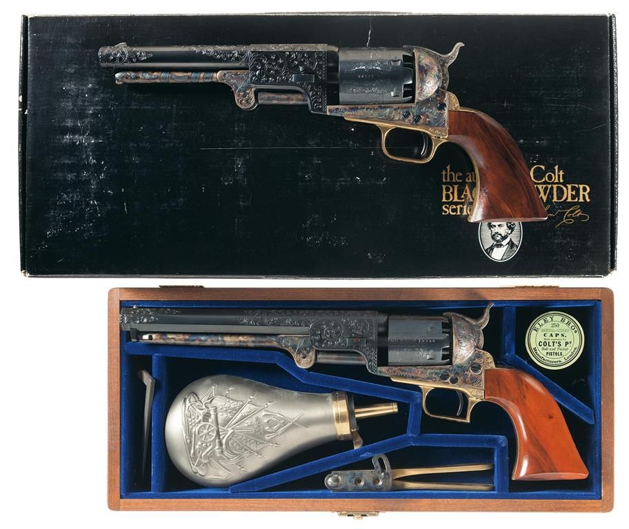 B) Has the same type of engraving as "A". Fitted with a smooth walnut one piece grip. Comes with a walnut Colt case lined in royal blue velvet, an empty cap tin, a two cavity bullet mold, powder flask, nipple wrench/screwdriver and the original box numbered to the gun.