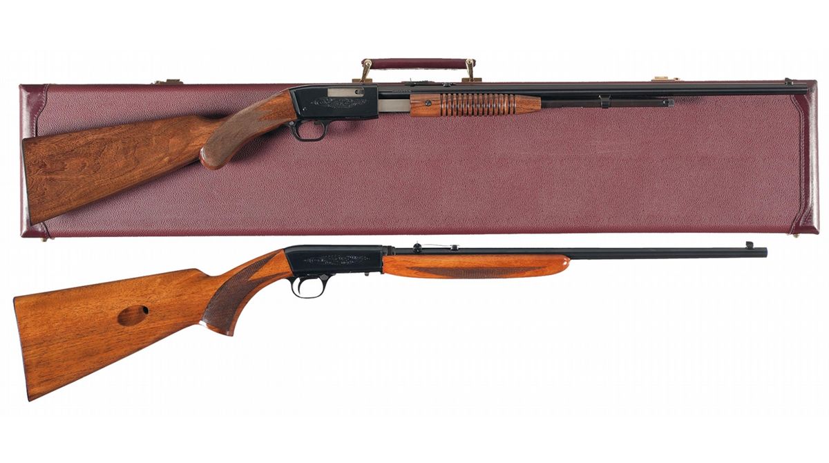 - B) Manufactured 1956-60. Scroll engraved receiver with checkered forearm and grip. Whell adjustable rear sight. The buttstock magazine tube plate is numbered T60166.